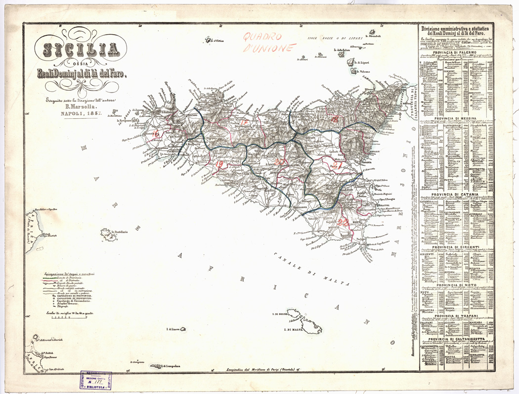 "...DIVISA IN SINGOLE PROVINCIE. Carta in ventitre fogli montati su tela, stampati a colori in litografia, eseguiti sotto la direzione dell'autore B. Marzolla. Annesso un foglio d'insieme per il Regno delle Due Sicilie alla scala di 1:2.500.000 circa, su cui trovasi scritto: "Atlante geografico di B. Marzolla pubblicandosi ora da L. Manzella, Napoli 1859, nello Stabilimento Geografico". Le carte distinguono a segni e colori i confini di stato, di provincia, di distretto, di circondario, di comune, le strade regie postali, rotabili, in costruzione, sentieri per cavalli e per pedoni, stazioni di posta, telegrafi. L'orografia è rappresentata col tratteggio a luce obliqua. Ciascun foglio contiene attorno al campo disegnato un quadro statistico-amministrativo, ed ampie notizie storiche e di geografia fisica ed economica: ognuno è distinto da un titolo particolare. Una carta analoga si trova alla Cart. d'Arch. n. 86 Docum. n. 11. "