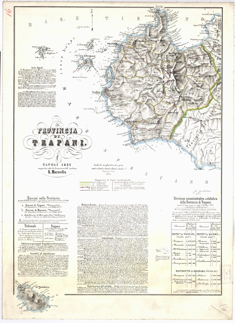 "...DIVISA IN SINGOLE PROVINCIE. Carta in ventitre fogli montati su tela, stampati a colori in litografia, eseguiti sotto la direzione dell'autore B. Marzolla. Annesso un foglio d'insieme per il Regno delle Due Sicilie alla scala di 1:2.500.000 circa, su cui trovasi scritto: "Atlante geografico di B. Marzolla pubblicandosi ora da L. Manzella, Napoli 1859, nello Stabilimento Geografico". Le carte distinguono a segni e colori i confini di stato, di provincia, di distretto, di circondario, di comune, le strade regie postali, rotabili, in costruzione, sentieri per cavalli e per pedoni, stazioni di posta, telegrafi. L'orografia è rappresentata col tratteggio a luce obliqua. Ciascun foglio contiene attorno al campo disegnato un quadro statistico-amministrativo, ed ampie notizie storiche e di geografia fisica ed economica: ognuno è distinto da un titolo particolare. Una carta analoga si trova alla Cart. d'Arch. n. 86 Docum. n. 11. "