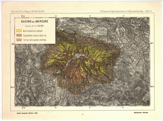"Autore: De Lorenzo, Laghi pleistocenici dell'Italia meridionale. Editore: I.G.M. (FI) Rappresentazione orografica a curve di livello e tratteggio."