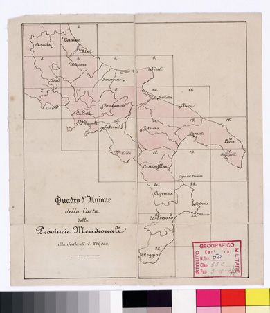 "IN FOGLI 25 FOTOINCISA COL PROCEDIMENTO DEL GENERALE AVET ALLA SCALA DI 1:250.000 PUBBLICATA DALL'ISTITUTO TOPOGRAFICO MILITARE, 1874. Bella, pregevolissima carta. E' in 25 fogli oltre il foglio titolo. Su di questo sono dati i seguenti " Cenni sulla costruzione della Carta " : "Questa carta corografica è tratta da una topografica disegnata a mano alla scala di 1: 103.680, che si trovava negli Archivi dell ' ex- Ufficio Topografico di Napoli e che era dovuta allo Stato Maggiore Austriaco. Essa fu eseguita durante l ' occupazione di quel Regno dal 1821 al 1824, e ne fu fondamento la nota carta del Rizzi-Zannoni, di cui la Carta Austriaca è per così dire una trasformazione. Difatti la planimetria fu poco o punto modificata ma si dette un maggior rilievo all ' orografia, sostituendo, previe ricognizioni sul terreno, il metodo del tratteggio a luce zenitale, a quello della prospettiva cavaliera col quale sono rappresentate le alture nelle Carte del Zannoni. Non è certamente, né può essere un lavoro di grande esattezza geometrica, come quello che non dipende da rilievi regolari e molto meno da coordinazione di questi ad una rete di punti geodetici. Nonostante il Comitato dello Stato Maggiore credè di rendere un servizio alle varie Amministrazioni dello Stato ed al pubblico, deliberando, sin dall ' anno 1868, di utilizzarla (in via transitoria e intanto che si compivano i rilievi regolari nelle provincie meridionali) con lo scopo di somministrare una guida sufficiente al militare, al geografo ed al viaggiatore. La carta fu riconosciuta sul terreno negli anni 1868-1869 onde completarvi il sistema delle strade rotabili a fondo manufatto. Di poi si operò il disegno dei vari fogli alla scala di 1: 250.000, che fu adottata per la pubblicazione. Così ridotta essa consta di 25 fogli. La riproduzione ne fu eseguita con il sistema di fotoincisione del Maggior Generale Conte Avet ". (vedi: N. 39 d'Ordine, Cart. d'Arch. N° 71 - Docum. N° 9021 - Files A0001415-1491, e N. 61 d' Ordine, Cart. d 'Arch. N° 72 Docum. N° 9022 - Files A0001537-1594). Alla carta è unito un quadro di unione. Due copie, una delle quali incompleta e l'altra, completa, riveduta dal 1882-1884. La carta completa si trova in biblioteca è montata su tela a stacchi n. di inventario generale 50, schedario carte generali Italia. In archivio (Cart. d'Arch. N. 90 - Docum. n. 26 - Files A0002825-2844) si trova la copia parziale delle carte (mancano i seguenti fogli: 9, 13, 15, 16, 17, 20, 25) non è montata su tela."