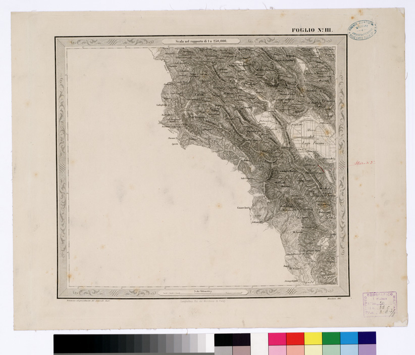 "...IN FOGLI 25 FOTOINCISA COL PROCEDIMENTO DEL GENERALE AVET ALLA SCALA DI 1:250.000 PUBBLICATA DALL'ISTITUTO TOPOGRAFICO MILITARE, 1874. Bella, pregevolissima carta. E' in 25 fogli oltre il foglio titolo. Su di questo sono dati i seguenti " Cenni sulla costruzione della Carta " : "Questa carta corografica è tratta da una topografica disegnata a mano alla scala di 1: 103.680, che si trovava negli Archivi dell ' ex- Ufficio Topografico di Napoli e che era dovuta allo Stato Maggiore Austriaco. Essa fu eseguita durante l ' occupazione di quel Regno dal 1821 al 1824, e ne fu fondamento la nota carta del Rizzi-Zannoni, di cui la Carta Austriaca è per così dire una trasformazione. Difatti la planimetria fu poco o punto modificata ma si dette un maggior rilievo all ' orografia, sostituendo, previe ricognizioni sul terreno, il metodo del tratteggio a luce zenitale, a quello della prospettiva cavaliera col quale sono rappresentate le alture nelle Carte del Zannoni. Non è certamente, né può essere un lavoro di grande esattezza geometrica, come quello che non dipende da rilievi regolari e molto meno da coordinazione di questi ad una rete di punti geodetici. Nonostante il Comitato dello Stato Maggiore credè di rendere un servizio alle varie Amministrazioni dello Stato ed al pubblico, deliberando, sin dall ' anno 1868, di utilizzarla (in via transitoria e intanto che si compivano i rilievi regolari nelle provincie meridionali) con lo scopo di somministrare una guida sufficiente al militare, al geografo ed al viaggiatore. La carta fu riconosciuta sul terreno negli anni 1868-1869 onde completarvi il sistema delle strade rotabili a fondo manufatto. Di poi si operò il disegno dei vari fogli alla scala di 1: 250.000, che fu adottata per la pubblicazione. Così ridotta essa consta di 25 fogli. La riproduzione ne fu eseguita con il sistema di fotoincisione del Maggior Generale Conte Avet ". (vedi: N. 39 d'Ordine, Cart. d'Arch. N° 71 - Docum. N° 9021 - Files A0001415-1491, e N. 61 d' Ordine, Cart. d 'Arch. N° 72 Docum. N° 9022 - Files A0001537-1594). Alla carta è unito un quadro di unione. Due copie, una delle quali incompleta e l'altra, completa, riveduta dal 1882-1884. La carta completa si trova in biblioteca è montata su tela a stacchi n. di inventario generale 50, schedario carte generali Italia. In archivio (Cart. d'Arch. N. 90 - Docum. n. 26 - Files A0002825-2844) si trova la copia parziale delle carte (mancano i seguenti fogli: 9, 13, 15, 16, 17, 20, 25) non è montata su tela."