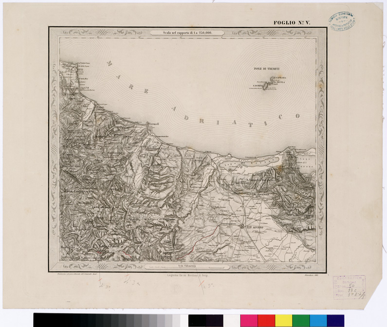 "...IN FOGLI 25 FOTOINCISA COL PROCEDIMENTO DEL GENERALE AVET ALLA SCALA DI 1:250.000 PUBBLICATA DALL'ISTITUTO TOPOGRAFICO MILITARE, 1874. Bella, pregevolissima carta. E' in 25 fogli oltre il foglio titolo. Su di questo sono dati i seguenti " Cenni sulla costruzione della Carta " : "Questa carta corografica è tratta da una topografica disegnata a mano alla scala di 1: 103.680, che si trovava negli Archivi dell ' ex- Ufficio Topografico di Napoli e che era dovuta allo Stato Maggiore Austriaco. Essa fu eseguita durante l ' occupazione di quel Regno dal 1821 al 1824, e ne fu fondamento la nota carta del Rizzi-Zannoni, di cui la Carta Austriaca è per così dire una trasformazione. Difatti la planimetria fu poco o punto modificata ma si dette un maggior rilievo all ' orografia, sostituendo, previe ricognizioni sul terreno, il metodo del tratteggio a luce zenitale, a quello della prospettiva cavaliera col quale sono rappresentate le alture nelle Carte del Zannoni. Non è certamente, né può essere un lavoro di grande esattezza geometrica, come quello che non dipende da rilievi regolari e molto meno da coordinazione di questi ad una rete di punti geodetici. Nonostante il Comitato dello Stato Maggiore credè di rendere un servizio alle varie Amministrazioni dello Stato ed al pubblico, deliberando, sin dall ' anno 1868, di utilizzarla (in via transitoria e intanto che si compivano i rilievi regolari nelle provincie meridionali) con lo scopo di somministrare una guida sufficiente al militare, al geografo ed al viaggiatore. La carta fu riconosciuta sul terreno negli anni 1868-1869 onde completarvi il sistema delle strade rotabili a fondo manufatto. Di poi si operò il disegno dei vari fogli alla scala di 1: 250.000, che fu adottata per la pubblicazione. Così ridotta essa consta di 25 fogli. La riproduzione ne fu eseguita con il sistema di fotoincisione del Maggior Generale Conte Avet ". (vedi: N. 39 d'Ordine, Cart. d'Arch. N° 71 - Docum. N° 9021 - Files A0001415-1491, e N. 61 d' Ordine, Cart. d 'Arch. N° 72 Docum. N° 9022 - Files A0001537-1594). Alla carta è unito un quadro di unione. Due copie, una delle quali incompleta e l'altra, completa, riveduta dal 1882-1884. La carta completa si trova in biblioteca è montata su tela a stacchi n. di inventario generale 50, schedario carte generali Italia. In archivio (Cart. d'Arch. N. 90 - Docum. n. 26 - Files A0002825-2844) si trova la copia parziale delle carte (mancano i seguenti fogli: 9, 13, 15, 16, 17, 20, 25) non è montata su tela."