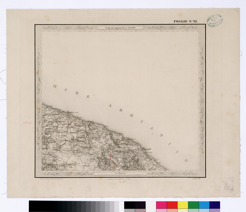 "...IN FOGLI 25 FOTOINCISA COL PROCEDIMENTO DEL GENERALE AVET ALLA SCALA DI 1:250.000 PUBBLICATA DALL'ISTITUTO TOPOGRAFICO MILITARE, 1874. Bella, pregevolissima carta. E' in 25 fogli oltre il foglio titolo. Su di questo sono dati i seguenti " Cenni sulla costruzione della Carta " : "Questa carta corografica è tratta da una topografica disegnata a mano alla scala di 1: 103.680, che si trovava negli Archivi dell ' ex- Ufficio Topografico di Napoli e che era dovuta allo Stato Maggiore Austriaco. Essa fu eseguita durante l ' occupazione di quel Regno dal 1821 al 1824, e ne fu fondamento la nota carta del Rizzi-Zannoni, di cui la Carta Austriaca è per così dire una trasformazione. Difatti la planimetria fu poco o punto modificata ma si dette un maggior rilievo all ' orografia, sostituendo, previe ricognizioni sul terreno, il metodo del tratteggio a luce zenitale, a quello della prospettiva cavaliera col quale sono rappresentate le alture nelle Carte del Zannoni. Non è certamente, né può essere un lavoro di grande esattezza geometrica, come quello che non dipende da rilievi regolari e molto meno da coordinazione di questi ad una rete di punti geodetici. Nonostante il Comitato dello Stato Maggiore credè di rendere un servizio alle varie Amministrazioni dello Stato ed al pubblico, deliberando, sin dall ' anno 1868, di utilizzarla (in via transitoria e intanto che si compivano i rilievi regolari nelle provincie meridionali) con lo scopo di somministrare una guida sufficiente al militare, al geografo ed al viaggiatore. La carta fu riconosciuta sul terreno negli anni 1868-1869 onde completarvi il sistema delle strade rotabili a fondo manufatto. Di poi si operò il disegno dei vari fogli alla scala di 1: 250.000, che fu adottata per la pubblicazione. Così ridotta essa consta di 25 fogli. La riproduzione ne fu eseguita con il sistema di fotoincisione del Maggior Generale Conte Avet ". (vedi: N. 39 d'Ordine, Cart. d'Arch. N° 71 - Docum. N° 9021 - Files A0001415-1491, e N. 61 d' Ordine, Cart. d 'Arch. N° 72 Docum. N° 9022 - Files A0001537-1594). Alla carta è unito un quadro di unione. Due copie, una delle quali incompleta e l'altra, completa, riveduta dal 1882-1884. La carta completa si trova in biblioteca è montata su tela a stacchi n. di inventario generale 50, schedario carte generali Italia. In archivio (Cart. d'Arch. N. 90 - Docum. n. 26 - Files A0002825-2844) si trova la copia parziale delle carte (mancano i seguenti fogli: 9, 13, 15, 16, 17, 20, 25) non è montata su tela."