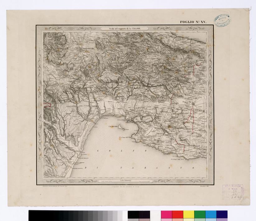 "...IN FOGLI 25 FOTOINCISA COL PROCEDIMENTO DEL GENERALE AVET ALLA SCALA DI 1:250.000 PUBBLICATA DALL'ISTITUTO TOPOGRAFICO MILITARE, 1874. Bella, pregevolissima carta. E' in 25 fogli oltre il foglio titolo. Su di questo sono dati i seguenti " Cenni sulla costruzione della Carta " : "Questa carta corografica è tratta da una topografica disegnata a mano alla scala di 1: 103.680, che si trovava negli Archivi dell ' ex- Ufficio Topografico di Napoli e che era dovuta allo Stato Maggiore Austriaco. Essa fu eseguita durante l ' occupazione di quel Regno dal 1821 al 1824, e ne fu fondamento la nota carta del Rizzi-Zannoni, di cui la Carta Austriaca è per così dire una trasformazione. Difatti la planimetria fu poco o punto modificata ma si dette un maggior rilievo all ' orografia, sostituendo, previe ricognizioni sul terreno, il metodo del tratteggio a luce zenitale, a quello della prospettiva cavaliera col quale sono rappresentate le alture nelle Carte del Zannoni. Non è certamente, né può essere un lavoro di grande esattezza geometrica, come quello che non dipende da rilievi regolari e molto meno da coordinazione di questi ad una rete di punti geodetici. Nonostante il Comitato dello Stato Maggiore credè di rendere un servizio alle varie Amministrazioni dello Stato ed al pubblico, deliberando, sin dall ' anno 1868, di utilizzarla (in via transitoria e intanto che si compivano i rilievi regolari nelle provincie meridionali) con lo scopo di somministrare una guida sufficiente al militare, al geografo ed al viaggiatore. La carta fu riconosciuta sul terreno negli anni 1868-1869 onde completarvi il sistema delle strade rotabili a fondo manufatto. Di poi si operò il disegno dei vari fogli alla scala di 1: 250.000, che fu adottata per la pubblicazione. Così ridotta essa consta di 25 fogli. La riproduzione ne fu eseguita con il sistema di fotoincisione del Maggior Generale Conte Avet ". (vedi: N. 39 d'Ordine, Cart. d'Arch. N° 71 - Docum. N° 9021 - Files A0001415-1491, e N. 61 d' Ordine, Cart. d 'Arch. N° 72 Docum. N° 9022 - Files A0001537-1594). Alla carta è unito un quadro di unione. Due copie, una delle quali incompleta e l'altra, completa, riveduta dal 1882-1884. La carta completa si trova in biblioteca è montata su tela a stacchi n. di inventario generale 50, schedario carte generali Italia. In archivio (Cart. d'Arch. N. 90 - Docum. n. 26 - Files A0002825-2844) si trova la copia parziale delle carte (mancano i seguenti fogli: 9, 13, 15, 16, 17, 20, 25) non è montata su tela."