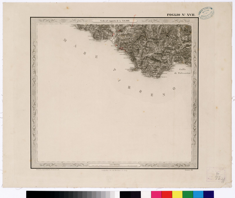 "...IN FOGLI 25 FOTOINCISA COL PROCEDIMENTO DEL GENERALE AVET ALLA SCALA DI 1:250.000 PUBBLICATA DALL'ISTITUTO TOPOGRAFICO MILITARE, 1874. Bella, pregevolissima carta. E' in 25 fogli oltre il foglio titolo. Su di questo sono dati i seguenti " Cenni sulla costruzione della Carta " : "Questa carta corografica è tratta da una topografica disegnata a mano alla scala di 1: 103.680, che si trovava negli Archivi dell ' ex- Ufficio Topografico di Napoli e che era dovuta allo Stato Maggiore Austriaco. Essa fu eseguita durante l ' occupazione di quel Regno dal 1821 al 1824, e ne fu fondamento la nota carta del Rizzi-Zannoni, di cui la Carta Austriaca è per così dire una trasformazione. Difatti la planimetria fu poco o punto modificata ma si dette un maggior rilievo all ' orografia, sostituendo, previe ricognizioni sul terreno, il metodo del tratteggio a luce zenitale, a quello della prospettiva cavaliera col quale sono rappresentate le alture nelle Carte del Zannoni. Non è certamente, né può essere un lavoro di grande esattezza geometrica, come quello che non dipende da rilievi regolari e molto meno da coordinazione di questi ad una rete di punti geodetici. Nonostante il Comitato dello Stato Maggiore credè di rendere un servizio alle varie Amministrazioni dello Stato ed al pubblico, deliberando, sin dall ' anno 1868, di utilizzarla (in via transitoria e intanto che si compivano i rilievi regolari nelle provincie meridionali) con lo scopo di somministrare una guida sufficiente al militare, al geografo ed al viaggiatore. La carta fu riconosciuta sul terreno negli anni 1868-1869 onde completarvi il sistema delle strade rotabili a fondo manufatto. Di poi si operò il disegno dei vari fogli alla scala di 1: 250.000, che fu adottata per la pubblicazione. Così ridotta essa consta di 25 fogli. La riproduzione ne fu eseguita con il sistema di fotoincisione del Maggior Generale Conte Avet ". (vedi: N. 39 d'Ordine, Cart. d'Arch. N° 71 - Docum. N° 9021 - Files A0001415-1491, e N. 61 d' Ordine, Cart. d 'Arch. N° 72 Docum. N° 9022 - Files A0001537-1594). Alla carta è unito un quadro di unione. Due copie, una delle quali incompleta e l'altra, completa, riveduta dal 1882-1884. La carta completa si trova in biblioteca è montata su tela a stacchi n. di inventario generale 50, schedario carte generali Italia. In archivio (Cart. d'Arch. N. 90 - Docum. n. 26 - Files A0002825-2844) si trova la copia parziale delle carte (mancano i seguenti fogli: 9, 13, 15, 16, 17, 20, 25) non è montata su tela."