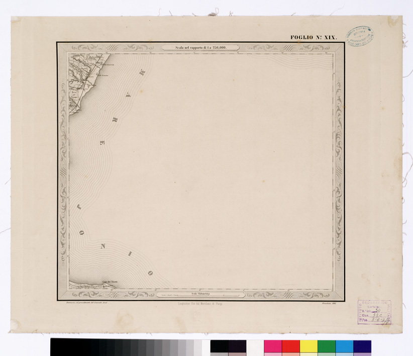 "...IN FOGLI 25 FOTOINCISA COL PROCEDIMENTO DEL GENERALE AVET ALLA SCALA DI 1:250.000 PUBBLICATA DALL'ISTITUTO TOPOGRAFICO MILITARE, 1874. Bella, pregevolissima carta. E' in 25 fogli oltre il foglio titolo. Su di questo sono dati i seguenti " Cenni sulla costruzione della Carta " : "Questa carta corografica è tratta da una topografica disegnata a mano alla scala di 1: 103.680, che si trovava negli Archivi dell ' ex- Ufficio Topografico di Napoli e che era dovuta allo Stato Maggiore Austriaco. Essa fu eseguita durante l ' occupazione di quel Regno dal 1821 al 1824, e ne fu fondamento la nota carta del Rizzi-Zannoni, di cui la Carta Austriaca è per così dire una trasformazione. Difatti la planimetria fu poco o punto modificata ma si dette un maggior rilievo all ' orografia, sostituendo, previe ricognizioni sul terreno, il metodo del tratteggio a luce zenitale, a quello della prospettiva cavaliera col quale sono rappresentate le alture nelle Carte del Zannoni. Non è certamente, né può essere un lavoro di grande esattezza geometrica, come quello che non dipende da rilievi regolari e molto meno da coordinazione di questi ad una rete di punti geodetici. Nonostante il Comitato dello Stato Maggiore credè di rendere un servizio alle varie Amministrazioni dello Stato ed al pubblico, deliberando, sin dall ' anno 1868, di utilizzarla (in via transitoria e intanto che si compivano i rilievi regolari nelle provincie meridionali) con lo scopo di somministrare una guida sufficiente al militare, al geografo ed al viaggiatore. La carta fu riconosciuta sul terreno negli anni 1868-1869 onde completarvi il sistema delle strade rotabili a fondo manufatto. Di poi si operò il disegno dei vari fogli alla scala di 1: 250.000, che fu adottata per la pubblicazione. Così ridotta essa consta di 25 fogli. La riproduzione ne fu eseguita con il sistema di fotoincisione del Maggior Generale Conte Avet ". (vedi: N. 39 d'Ordine, Cart. d'Arch. N° 71 - Docum. N° 9021 - Files A0001415-1491, e N. 61 d' Ordine, Cart. d 'Arch. N° 72 Docum. N° 9022 - Files A0001537-1594). Alla carta è unito un quadro di unione. Due copie, una delle quali incompleta e l'altra, completa, riveduta dal 1882-1884. La carta completa si trova in biblioteca è montata su tela a stacchi n. di inventario generale 50, schedario carte generali Italia. In archivio (Cart. d'Arch. N. 90 - Docum. n. 26 - Files A0002825-2844) si trova la copia parziale delle carte (mancano i seguenti fogli: 9, 13, 15, 16, 17, 20, 25) non è montata su tela."