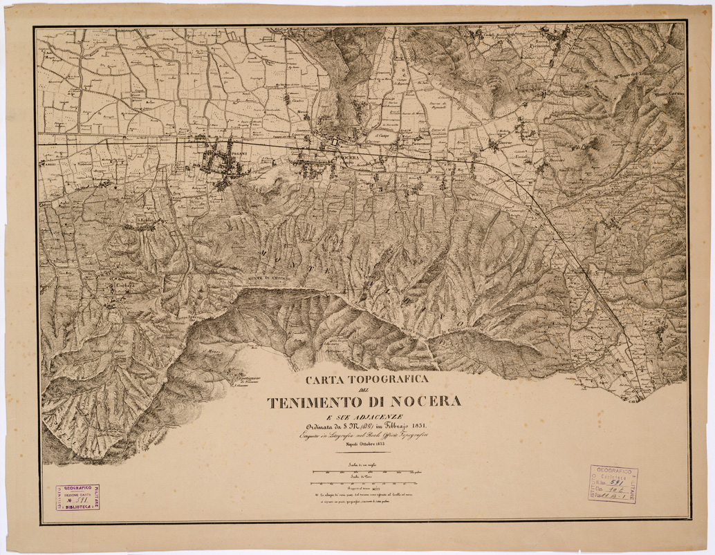 "...ORDINATA DA S. M. (D. G.) IN FEBBRAIO 1831. ESEGUITA IN LITOGRAFIA NEL REALE OFFICIO TOPOGRAFICO NAPOLI. Un foglio stampato in nero con orografia dimostrativa a mezzo di tratteggio e quote calcolate in passi geografici ognuno di 7 palmi, riferiti al livello del mare. Il territorio rappresentato si estende da Rocca Piemonte (nord) a Cava (sud) e da Angri (ovest) a Monte Caruso (est). "