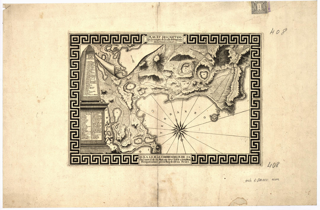 "...RENDU A LA DERNIERE PERFECTION PAR C. LE SIEUR ETIENNE GIRARD ARCHITECTE, L. 1771. Incisione su rame dei dintorni di Pozzuoli. Foglio unico. Orientazione: il Nord è spostato verso sinistra. Orografia rappresentata col tratteggio. A sinistra elenco numerico delle costruzioni e dei luoghi principali. In basso: "D. D. A. S. E. M. Le Commendeur de S. A. du Conseil de Sa Majeste treé (sic) fidele et Son Mini. Plenipotentiaire pres le Roy des Deux Siciles". "