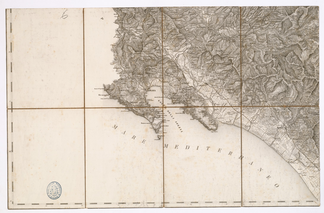 "...LEVATA DIETRO MISURE TRIGONOMETRICHE ALLA SCALA DI 1:28.000 PER ORDINE DI SUA ALTEZZA REALE FRANCESCO IV ARCIDUCA D'AUSTRIA, DUCA DI MODENA, ECC. DAL REGIO DUCALE CORPO DEL GENIO MILITARE ESTENSE. RIDOTTA ALLA SCALA DI 1:86.400 NELL'IMPERIALE REGIO I.G.M. DI VIENNA PUBBLICATA COL NUOVO RIPARTO TERRITORIALE, 1849. Carta in otto fogli, compreso il titolo e il quadro dei segni convenzionali, incisi su rame, costruita sulla base dei rilevamenti compiuti dall’Ufficio Topografico modenese, alla scala di 1:28 000, dal 1821 al 1829, per convenzione del 1821, con l’Istituto Militare Geografico, secondo i sistemi dello Stato Maggiore Austriaco. Ridotta e disegnata dall’Istituto Geografico Austriaco a Vienna, nel 1842 si da costituire la continuazione della carta alla stessa scala del Lombardo Veneto (v. N° 81 d’ordine, Cart. d’Arch. N° 52-53, Docum. 2 e 4). Per disegno, segni convenzionali, dimensioni, ecc., la carta corrisponde esattamente a quella già descritta del Lombardo - Veneto. V’è annesso un quadro d’unione in fotolito eseguito dall’I.G.M. di Firenze nel 1885, essendone la carta priva. La copia N° 8 è in fogli montati su tela. Per maggiori notizie vedasi Mori A., La Cartografia Ufficiale in Italia e l’I.G.M., pag. 55-56. La stessa carta è in libretto alla Collezione Pasqui n. 12, e alla Cart. d'Arch. N° 53 Docum. N.i 7 e 8 (file A0001081-1090)."