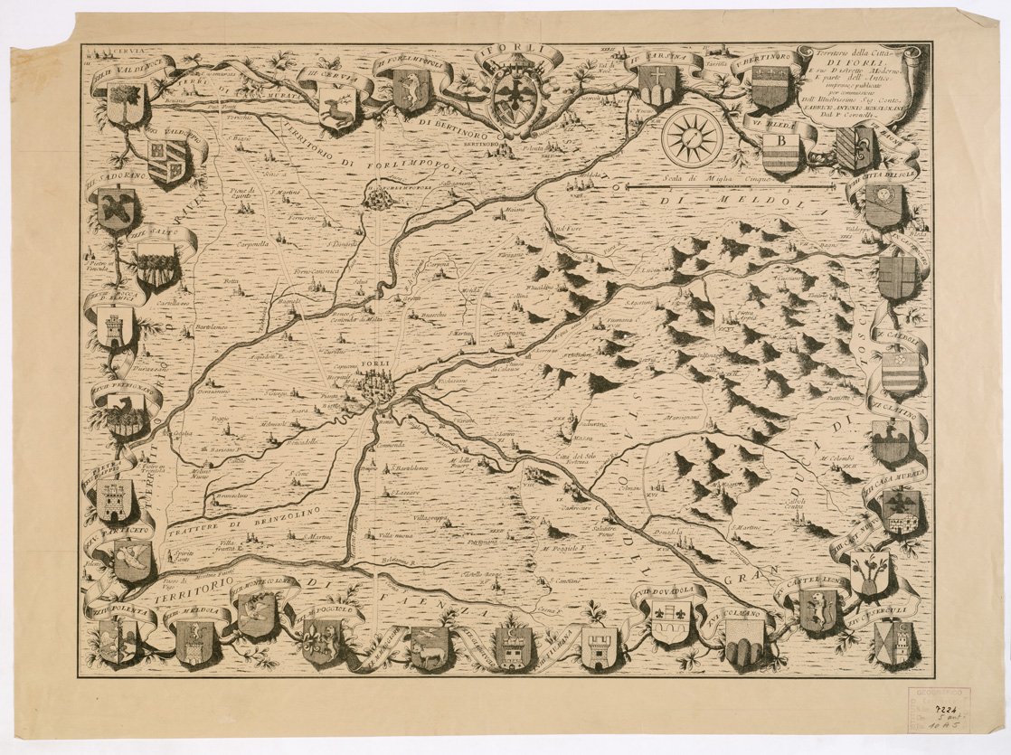 "...E SUO DISTRETTO MODERNO E PARTE DELL'ANTICO, IMPRESSO E PUBBLICATO PER COMMISSIONE DELL'ILLUSTRISSIMO SIG. CONTE FABRICIO ANTONIO MONSIGNANI DAL P. CORONELLI. Autore P. Coronelli. Tipo di stampa in nero."