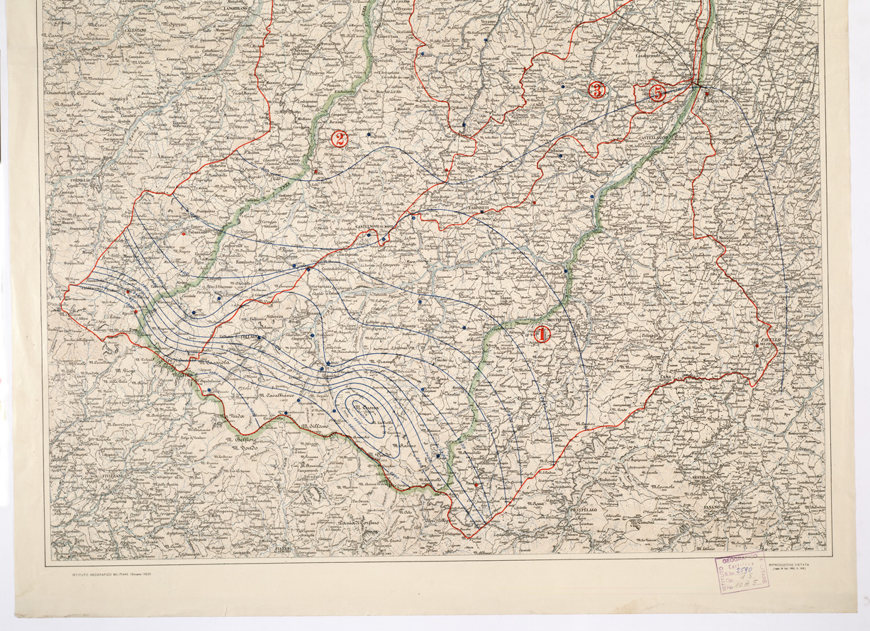 La “Grande Guerra” rallentò notevolmente l´attività topocartografica programmata e quasi tutte le energie dell´Istituto furono profuse per i lavori topografici di supporto alle operazioni militari. Dopo il trattato di pace i primi lavori cartografici riguardarono i territori redenti.