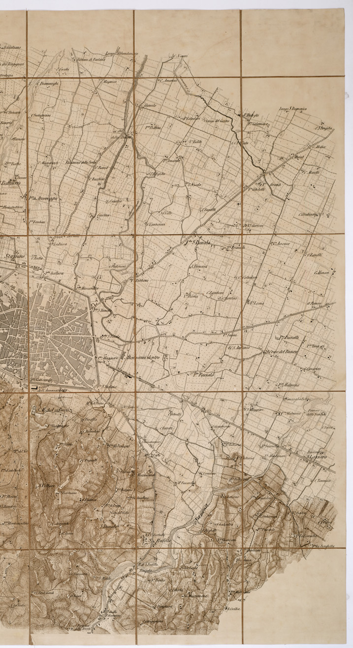"Un foglio montato su tela a stacchi con orografia dimostrata a mezzo di tratteggio in bistro. Scale grafiche in metri, passi e miglia geometriche."