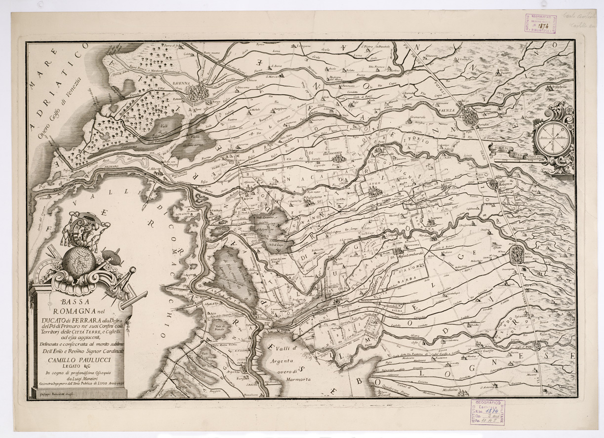 "DELINEATA E CONSECRATA AL MERITO SUBLIME DELL'EM.O E REV.MO SIGNOR CARDINALE CAMILLO PAULUCCI LEGATO & C. IN SEGNO DI PROFONDISSIMO OSSEQUIO DA LUIGI MANZIERI GEOMETRA INGEGNERO DELL'ILL.MO PUBLICO DI LUGO. ANNO 1750. Incisione su rame di Giuseppe Benedetti. Foglio unico montato su tela a stacchi. Orientazione: il nord è spostato in basso nell'angolo a sinistra. Orografia prospettica. Abitati principali rappresentati schematicamente in pianta prospettica: i secondari con torri e case. Sono tracciate le strade. Scala grafica in miglia italiane. Tre copie. Cfr. la copia Coll. Bianconi n. 184 - File B0002387."