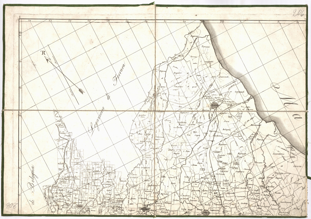 "...LA QUALE VIENE DISTINTA NELLE ANTICHE COMUNI E VILLE CHE LA COMPONGONO, COLLA UBICAZIONE DELLE TERRE, CASTELLI, CHIESE, PONTI, PASSI E POSTE, MEDIANTE SEGNI DI CUI ABBASSO SE NE DA LA SPIEGAZIONE E CHE SI UNISCE ALL'ALTRA DELLE LEGAZIONI DI BOLOGNA E FERRARA. IL TUTTO RILEVATO IN ESATTE MISURE E DELINEATO DA GIUSEPPE CANTONI INGEGNERE E PUBBLICATO A SUE SPESE. (s. d.). Carta in quattro fogli montati su tela. Incisione di Gajani e Mollini. Orientazione: il nord è spostato a sinistra. Proiezione piana. Il reticolato geografico corrisponde ad una maglia di 3' di longitudine per 3' di latitudine. Rappresenta la sola planimetria. (V. il N° 64 d'ordine Collez. Bianconi N° 176 - Files B0002389-90). "