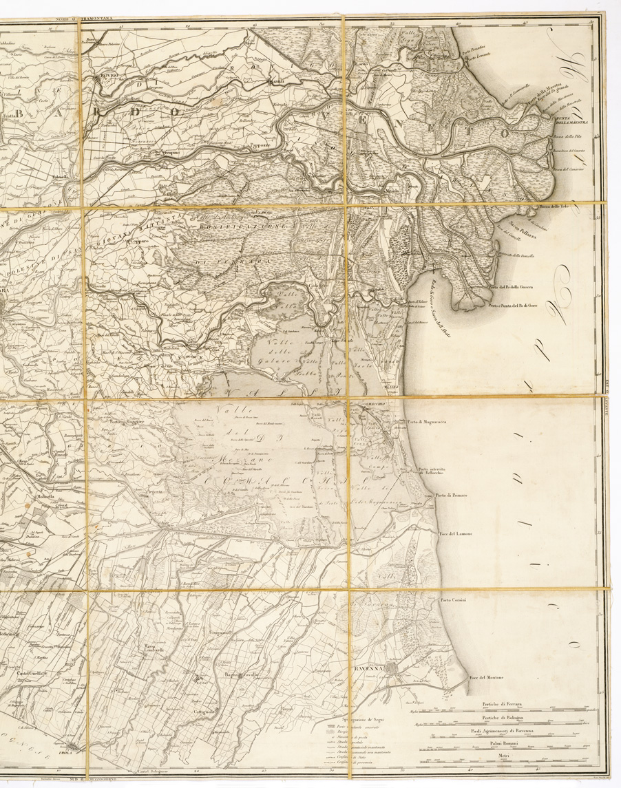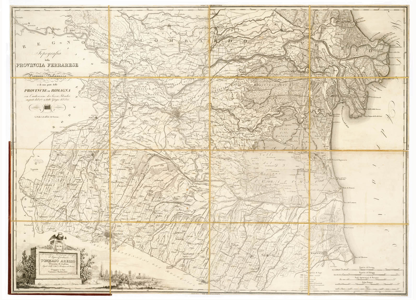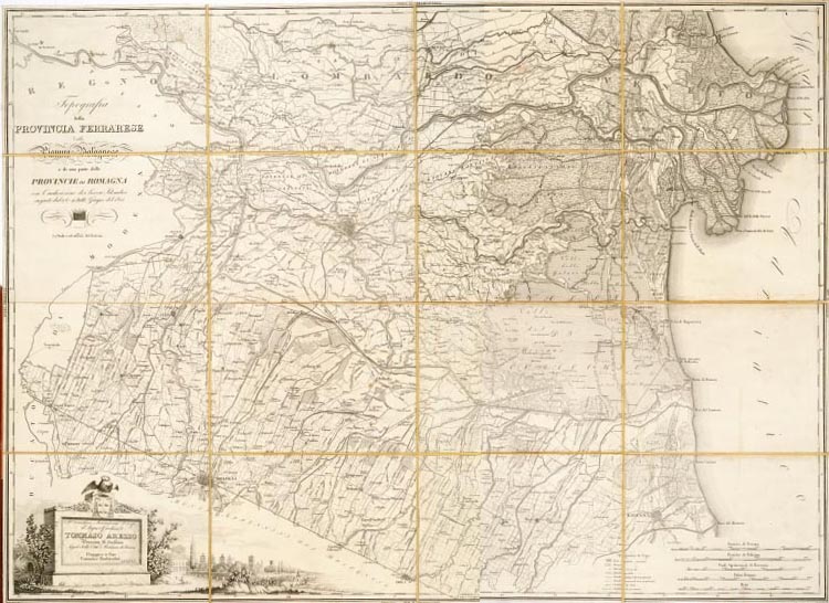 "ESEGUITI DAL 1767 A TUTTO GIUGNO DEL 1825. Foglio unico montato su tela a stacchi. Disegno di Carlo Mayr e incisione dei Frat. Stucchi. Si estende da oltre Rovigo (nord) a Castel Bolognese (sud) e da Nomantola (ovest) all'Adriatico (est). Molto dettagliata. Dedicata al Cardinale Tommaso Arezzo dall'Ing. Tommaso Barbantini che dirresse il lavoro. Cinque scale grafiche. Tre copie. Cfr. la stessa carta Coll. Bianconi n. 185 (Files B00012897-98) e n. 185 bis (Files B0002274-75) - Numero d'Ordine 74."