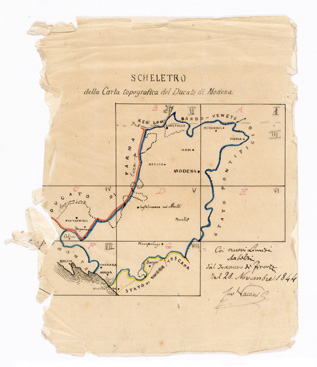 "LEVATA DIETRO MISURE TRIGONOMETRICHE ALLA SCALA DI 1:28.000 PER ORDINE DI SUA ALTEZZA REALE FRANCESCO IV ARCIDUCA D'AUSTRIA, DUCA DI MODENA, ECC. DAL REGIO DUCALE CORPO DEL GENIO MILITARE ESTENSE. RIDOTTA ALLA SCALA DI 1:86.400 NELL'IMPERIALE REGIO I.G.M. DI VIENNA PUBBLICATA COL NUOVO RIPARTO TERRITORIALE, 1849. Carta in otto fogli, compreso il titolo e il quadro dei segni convenzionali, incisi su rame, costruita sulla base dei rilevamenti compiuti dall'Ufficio Topografico modenese, alla scala di 1:28 000, dal 1821 al 1829, per convenzione del 1821, con l'Istituto Militare Geografico, secondo i sistemi dello Stato Maggiore Austriaco. Ridotta e disegnata dall'Istituto Geografico Austriaco a Vienna, nel 1842 si da costituire la continuazione della carta alla stessa scala del Lombardo Veneto (v. N° 81 d'ordine, Cart. d'Arch. N° 52-53, Docum. 2 e 4). Per disegno, segni convenzionali, dimensioni, ecc., la carta corrisponde esattamente a quella già descritta del Lombardo-Veneto. V'è annesso un quadro d'unione in fotolito eseguito dall'I.G.M. di Firenze nel 1885, essendone la carta priva. La copia N° 8 è in fogli montati su tela. Per maggiori notizie vedasi Mori A., La Cartografia Ufficiale in Italia e l'I.G.M., pag. 55-56. Questa carta si trova in biblioteca, fa parte della collezione Pasqui ed è collocata in libretto. In biblioteca vi è un'altra copia al numero d'inventario 1763. Una sua copia è collocata alla Cart. d'Arch. N° 53 Docum. N.i 7 e 8."