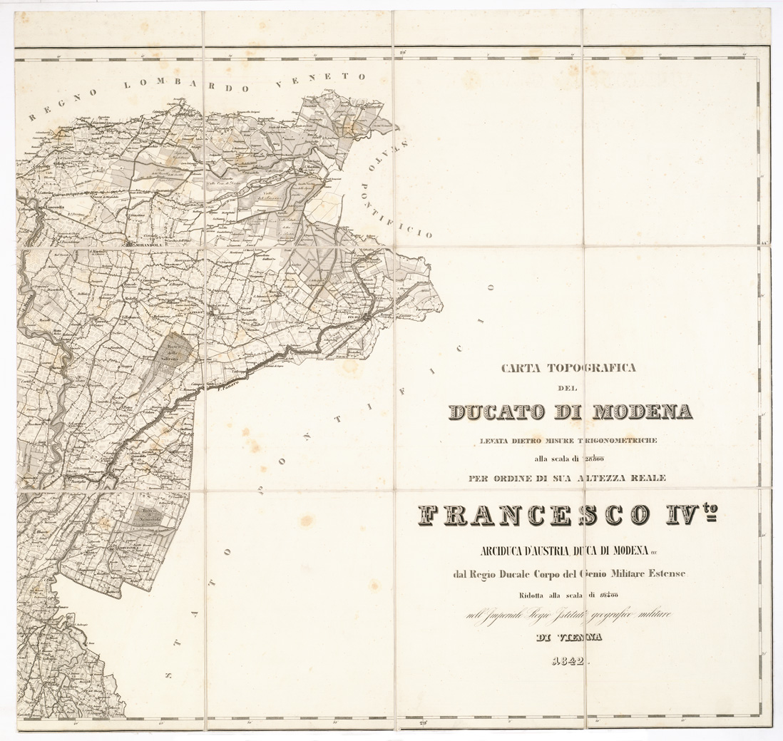 "...LEVATA DIETRO MISURE TRIGONOMETRICHE ALLA SCALA DI 1:28.000 PER ORDINE DI SUA ALTEZZA REALE FRANCESCO IV ARCIDUCA D'AUSTRIA, DUCA DI MODENA, ECC. DAL REGIO DUCALE CORPO DEL GENIO MILITARE ESTENSE. RIDOTTA ALLA SCALA DI 1:86.400 NELL'IMPERIALE REGIO I.G.M. DI VIENNA PUBBLICATA COL NUOVO RIPARTO TERRITORIALE, 1849. Carta in otto fogli, compreso il titolo e il quadro dei segni convenzionali, incisi su rame, costruita sulla base dei rilevamenti compiuti dall'Ufficio Topografico modenese, alla scala di 1:28 000, dal 1821 al 1829, per convenzione del 1821, con l'Istituto Militare Geografico, secondo i sistemi dello Stato Maggiore Austriaco. Ridotta e disegnata dall'Istituto Geografico Austriaco a Vienna, nel 1842 si da costituire la continuazione della carta alla stessa scala del Lombardo Veneto (v. N° 81 d'ordine, Cart. d'Arch. N° 52-53, Docum. 2 e 4). Per disegno, segni convenzionali, dimensioni, ecc., la carta corrisponde esattamente a quella già descritta del Lombardo-Veneto. V'è annesso un quadro d'unione in fotolito eseguito dall'I.G.M. di Firenze nel 1885, essendone la carta priva. La copia N° 8 è in fogli montati su tela. Per maggiori notizie vedasi Mori A., La Cartografia Ufficiale in Italia e l'I.G.M., pag. 55-56. Questa carta si trova in biblioteca, fa parte della collezione Pasqui ed è collocata in libretto. In biblioteca vi è un'altra copia al numero d'inventario 1763. Una sua copia è collocata alla Cart. d'Arch. N° 53 Docum. N.i 7 e 8."
