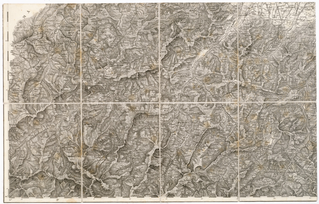"...LEVATA DIETRO MISURE TRIGONOMETRICHE ALLA SCALA DI 1:28.000 PER ORDINE DI SUA ALTEZZA REALE FRANCESCO IV ARCIDUCA D'AUSTRIA, DUCA DI MODENA, ECC. DAL REGIO DUCALE CORPO DEL GENIO MILITARE ESTENSE. RIDOTTA ALLA SCALA DI 1:86.400 NELL'IMPERIALE REGIO I.G.M. DI VIENNA PUBBLICATA COL NUOVO RIPARTO TERRITORIALE, 1849. Carta in otto fogli, compreso il titolo e il quadro dei segni convenzionali, incisi su rame, costruita sulla base dei rilevamenti compiuti dall'Ufficio Topografico modenese, alla scala di 1:28 000, dal 1821 al 1829, per convenzione del 1821, con l'Istituto Militare Geografico, secondo i sistemi dello Stato Maggiore Austriaco. Ridotta e disegnata dall'Istituto Geografico Austriaco a Vienna, nel 1842 si da costituire la continuazione della carta alla stessa scala del Lombardo Veneto (v. N° 81 d'ordine, Cart. d'Arch. N° 52-53, Docum. 2 e 4). Per disegno, segni convenzionali, dimensioni, ecc., la carta corrisponde esattamente a quella già descritta del Lombardo-Veneto. V'è annesso un quadro d'unione in fotolito eseguito dall'I.G.M. di Firenze nel 1885, essendone la carta priva. La copia N° 8 è in fogli montati su tela. Per maggiori notizie vedasi Mori A., La Cartografia Ufficiale in Italia e l'I.G.M., pag. 55-56. Questa carta si trova in biblioteca, fa parte della collezione Pasqui ed è collocata in libretto. In biblioteca vi è un'altra copia al numero d'inventario 1763. Una sua copia è collocata alla Cart. d'Arch. N° 53 Docum. N.i 7 e 8."