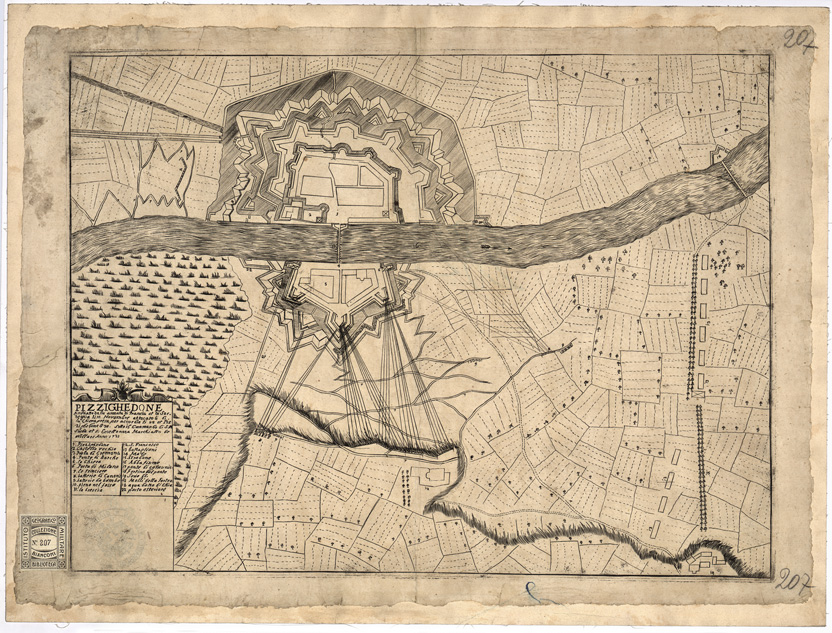 "...DALL´ARMATA DI FRANCIA E DI SARDEGNA LI 10 NOVEMBRE ATTACCATO E LI 6 ALLA GHIERA PRESA PER ACCOR....LI 12 ET PIZZIGHEDONE LI 30. SOTTO IL COMANDO DI S. M. ET S. ECCELLENZA MARCHIALLO DE WILLARS ANNO 1733. Pianta riferitasi all'assedio posto alla fortezza di Pizzighettone allora occupata dagli austriaci da Carlo Emanuele III durante la guerra di successione polacca. Un foglio inciso su rame con elenco numerico delle località e dei lavori di approccio per l'assedio. (C4) "