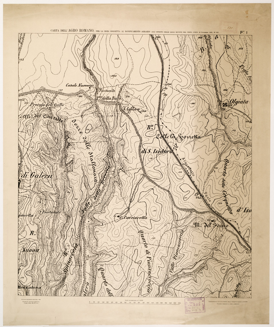 "...NEL RAPPORTO DI 1:8.000 PER LA ZONA SOGGETTA AL BONIFICAMENTO AGRARIO AGLI EFFETTI DELLE LEGGI RIUNITE IN TESTO UNICO CON R. D. NOVEMBRE 1905 N° 647. I.G.M., 1904. Ingrandimento fotozincografico in 77 fogli delle tavolette rilievo al 25.000. Stampa a colori in azzurro per le acque, verde per i limiti dell'agro romano, rosso per quelli della zona soggetta alla bonifica agraria, viola per il territorio suburbano di Roma, rosso per le tenute e le loro divisioni interne azzurro per le linee di spartiacque resto della planimetria in nero. Orografia a curve tracciate alla equidistanza di 5 metri. Annesso un quadro d'unione con elenco delle tenute private."