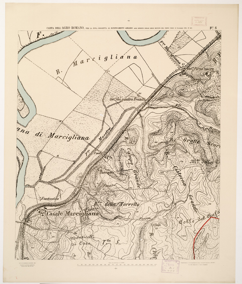 "...NEL RAPPORTO DI 1:8.000 PER LA ZONA SOGGETTA AL BONIFICAMENTO AGRARIO AGLI EFFETTI DELLE LEGGI RIUNITE IN TESTO UNICO CON R. D. NOVEMBRE 1905 N° 647. I.G.M., 1904. Ingrandimento fotozincografico in 77 fogli delle tavolette rilievo al 25.000. Stampa a colori in azzurro per le acque, verde per i limiti dell'agro romano, rosso per quelli della zona soggetta alla bonifica agraria, viola per il territorio suburbano di Roma, rosso per le tenute e le loro divisioni interne azzurro per le linee di spartiacque resto della planimetria in nero. Orografia a curve tracciate alla equidistanza di 5 metri. Annesso un quadro d'unione con elenco delle tenute private."