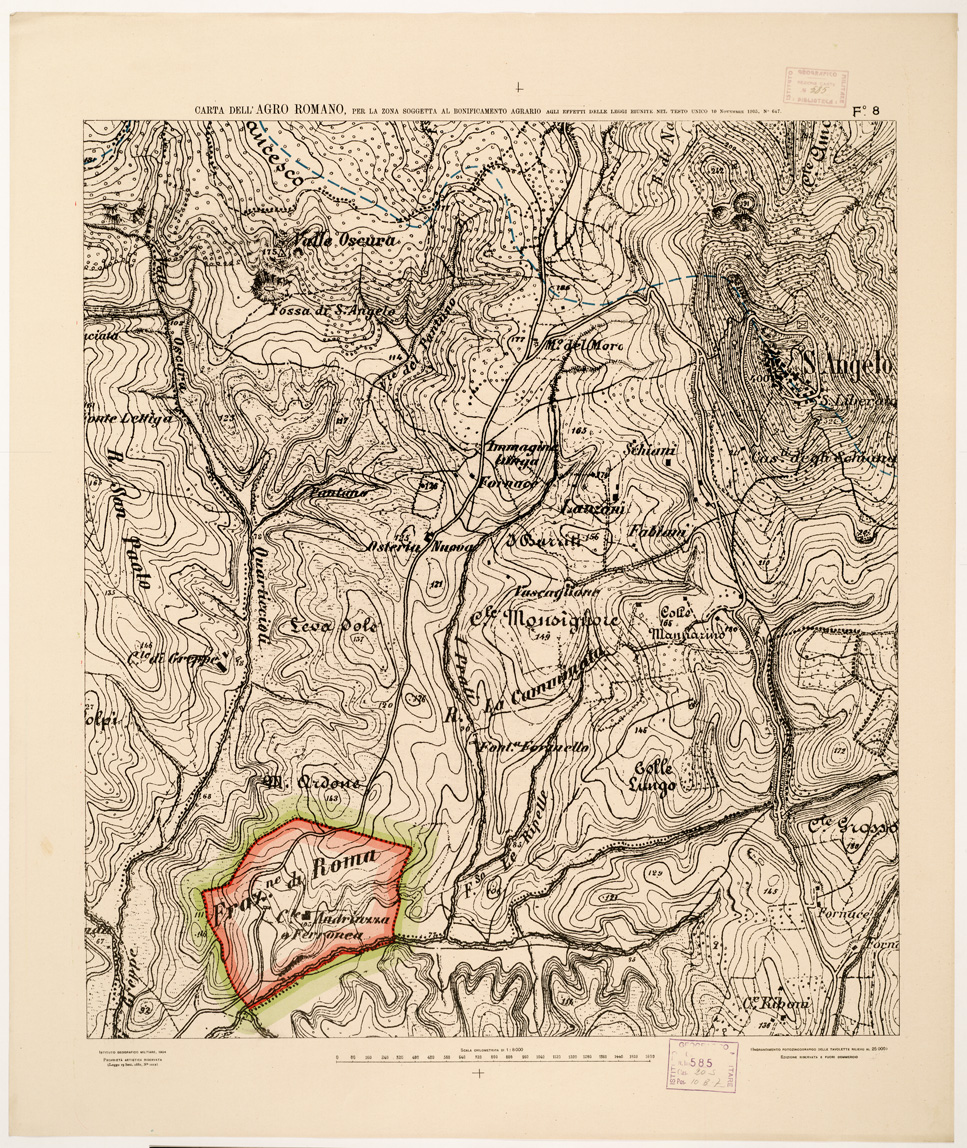"...NEL RAPPORTO DI 1:8.000 PER LA ZONA SOGGETTA AL BONIFICAMENTO AGRARIO AGLI EFFETTI DELLE LEGGI RIUNITE IN TESTO UNICO CON R. D. NOVEMBRE 1905 N° 647. I.G.M., 1904. Ingrandimento fotozincografico in 77 fogli delle tavolette rilievo al 25.000. Stampa a colori in azzurro per le acque, verde per i limiti dell'agro romano, rosso per quelli della zona soggetta alla bonifica agraria, viola per il territorio suburbano di Roma, rosso per le tenute e le loro divisioni interne azzurro per le linee di spartiacque resto della planimetria in nero. Orografia a curve tracciate alla equidistanza di 5 metri. Annesso un quadro d'unione con elenco delle tenute private."