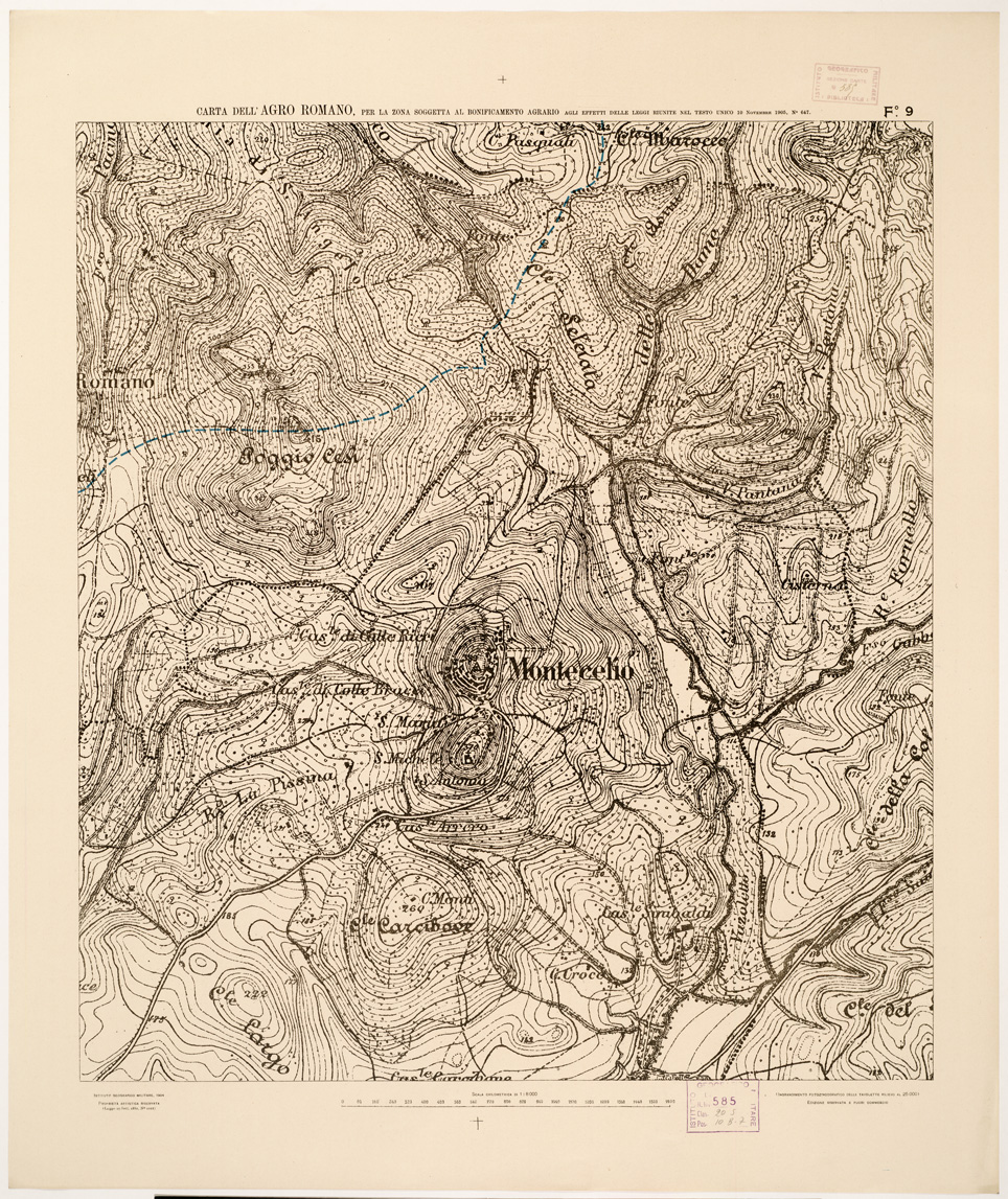 "...NEL RAPPORTO DI 1:8.000 PER LA ZONA SOGGETTA AL BONIFICAMENTO AGRARIO AGLI EFFETTI DELLE LEGGI RIUNITE IN TESTO UNICO CON R. D. NOVEMBRE 1905 N° 647. I.G.M., 1904. Ingrandimento fotozincografico in 77 fogli delle tavolette rilievo al 25.000. Stampa a colori in azzurro per le acque, verde per i limiti dell'agro romano, rosso per quelli della zona soggetta alla bonifica agraria, viola per il territorio suburbano di Roma, rosso per le tenute e le loro divisioni interne azzurro per le linee di spartiacque resto della planimetria in nero. Orografia a curve tracciate alla equidistanza di 5 metri. Annesso un quadro d'unione con elenco delle tenute private."