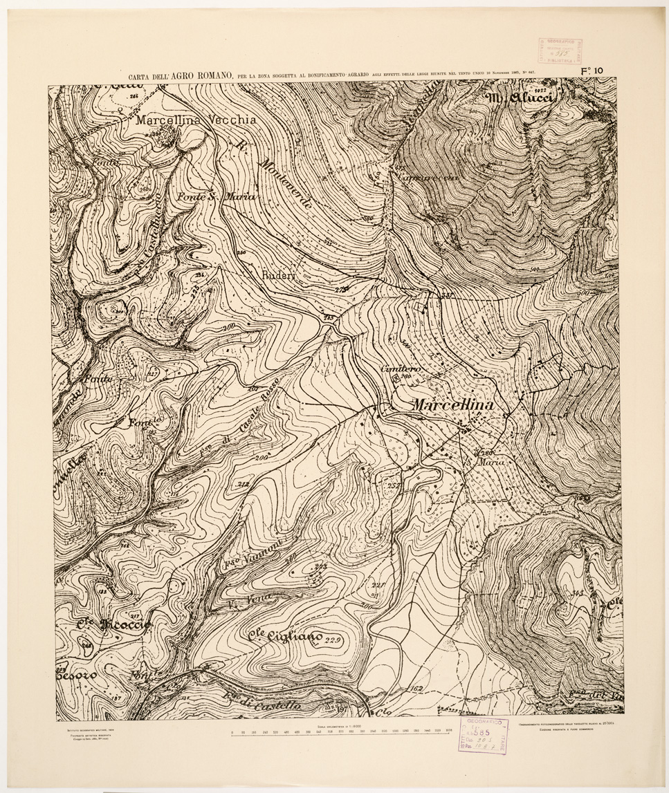 "...NEL RAPPORTO DI 1:8.000 PER LA ZONA SOGGETTA AL BONIFICAMENTO AGRARIO AGLI EFFETTI DELLE LEGGI RIUNITE IN TESTO UNICO CON R. D. NOVEMBRE 1905 N° 647. I.G.M., 1904. Ingrandimento fotozincografico in 77 fogli delle tavolette rilievo al 25.000. Stampa a colori in azzurro per le acque, verde per i limiti dell'agro romano, rosso per quelli della zona soggetta alla bonifica agraria, viola per il territorio suburbano di Roma, rosso per le tenute e le loro divisioni interne azzurro per le linee di spartiacque resto della planimetria in nero. Orografia a curve tracciate alla equidistanza di 5 metri. Annesso un quadro d'unione con elenco delle tenute private."