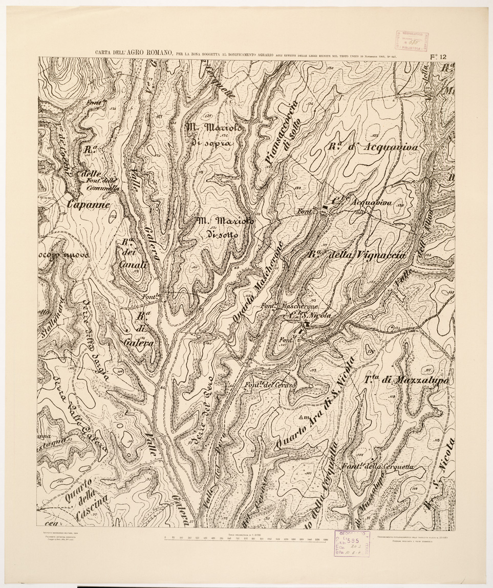 "...NEL RAPPORTO DI 1:8.000 PER LA ZONA SOGGETTA AL BONIFICAMENTO AGRARIO AGLI EFFETTI DELLE LEGGI RIUNITE IN TESTO UNICO CON R. D. NOVEMBRE 1905 N° 647. I.G.M., 1904. Ingrandimento fotozincografico in 77 fogli delle tavolette rilievo al 25.000. Stampa a colori in azzurro per le acque, verde per i limiti dell'agro romano, rosso per quelli della zona soggetta alla bonifica agraria, viola per il territorio suburbano di Roma, rosso per le tenute e le loro divisioni interne azzurro per le linee di spartiacque resto della planimetria in nero. Orografia a curve tracciate alla equidistanza di 5 metri. Annesso un quadro d'unione con elenco delle tenute private."