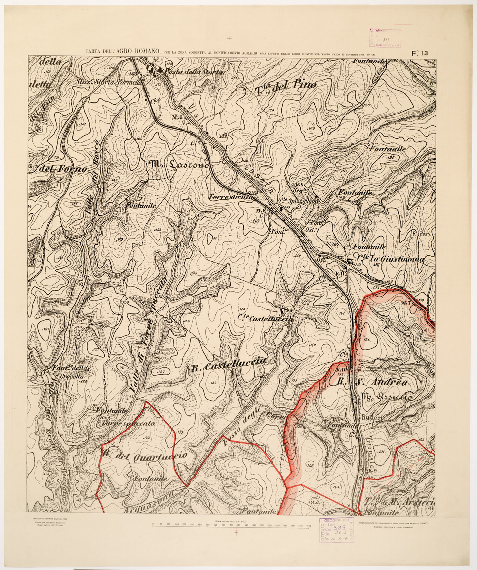"...NEL RAPPORTO DI 1:8.000 PER LA ZONA SOGGETTA AL BONIFICAMENTO AGRARIO AGLI EFFETTI DELLE LEGGI RIUNITE IN TESTO UNICO CON R. D. NOVEMBRE 1905 N° 647. I.G.M., 1904. Ingrandimento fotozincografico in 77 fogli delle tavolette rilievo al 25.000. Stampa a colori in azzurro per le acque, verde per i limiti dell'agro romano, rosso per quelli della zona soggetta alla bonifica agraria, viola per il territorio suburbano di Roma, rosso per le tenute e le loro divisioni interne azzurro per le linee di spartiacque resto della planimetria in nero. Orografia a curve tracciate alla equidistanza di 5 metri. Annesso un quadro d'unione con elenco delle tenute private."