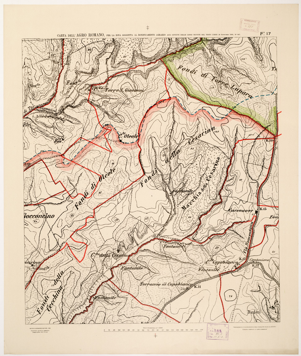 "...NEL RAPPORTO DI 1:8.000 PER LA ZONA SOGGETTA AL BONIFICAMENTO AGRARIO AGLI EFFETTI DELLE LEGGI RIUNITE IN TESTO UNICO CON R. D. NOVEMBRE 1905 N° 647. I.G.M., 1904. Ingrandimento fotozincografico in 77 fogli delle tavolette rilievo al 25.000. Stampa a colori in azzurro per le acque, verde per i limiti dell'agro romano, rosso per quelli della zona soggetta alla bonifica agraria, viola per il territorio suburbano di Roma, rosso per le tenute e le loro divisioni interne azzurro per le linee di spartiacque resto della planimetria in nero. Orografia a curve tracciate alla equidistanza di 5 metri. Annesso un quadro d'unione con elenco delle tenute private."