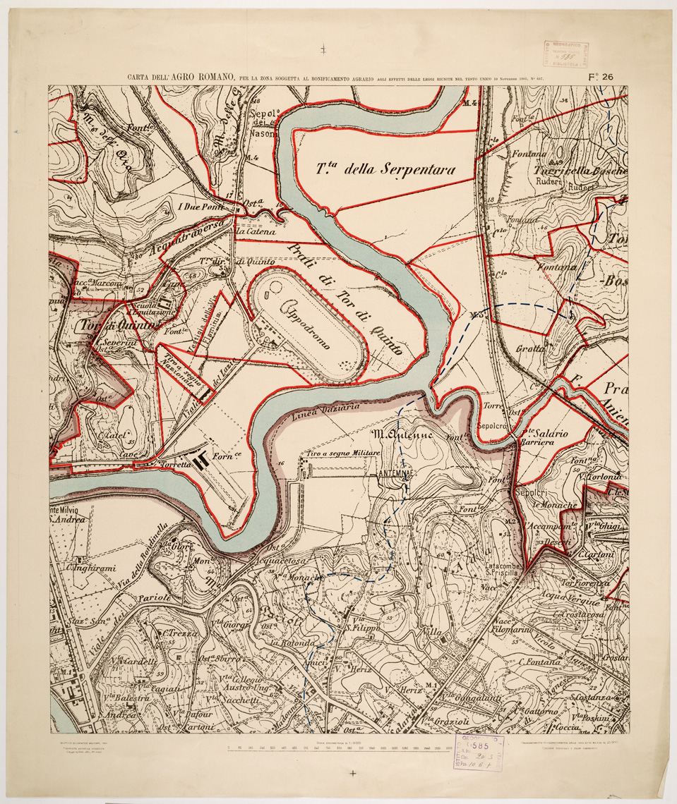 "...NEL RAPPORTO DI 1:8.000 PER LA ZONA SOGGETTA AL BONIFICAMENTO AGRARIO AGLI EFFETTI DELLE LEGGI RIUNITE IN TESTO UNICO CON R. D. NOVEMBRE 1905 N° 647. I.G.M., 1904. Ingrandimento fotozincografico in 77 fogli delle tavolette rilievo al 25.000. Stampa a colori in azzurro per le acque, verde per i limiti dell'agro romano, rosso per quelli della zona soggetta alla bonifica agraria, viola per il territorio suburbano di Roma, rosso per le tenute e le loro divisioni interne azzurro per le linee di spartiacque resto della planimetria in nero. Orografia a curve tracciate alla equidistanza di 5 metri. Annesso un quadro d'unione con elenco delle tenute private."