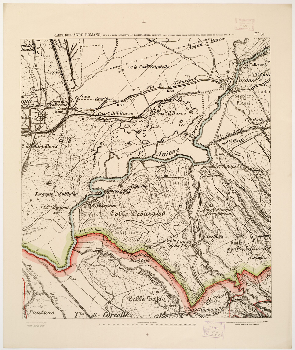 "...NEL RAPPORTO DI 1:8.000 PER LA ZONA SOGGETTA AL BONIFICAMENTO AGRARIO AGLI EFFETTI DELLE LEGGI RIUNITE IN TESTO UNICO CON R. D. NOVEMBRE 1905 N° 647. I.G.M., 1904. Ingrandimento fotozincografico in 77 fogli delle tavolette rilievo al 25.000. Stampa a colori in azzurro per le acque, verde per i limiti dell'agro romano, rosso per quelli della zona soggetta alla bonifica agraria, viola per il territorio suburbano di Roma, rosso per le tenute e le loro divisioni interne azzurro per le linee di spartiacque resto della planimetria in nero. Orografia a curve tracciate alla equidistanza di 5 metri. Annesso un quadro d'unione con elenco delle tenute private."