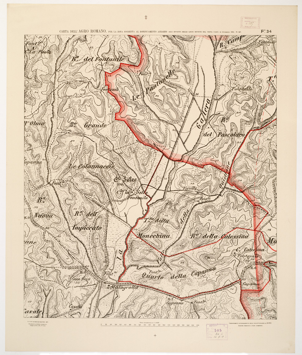 "...NEL RAPPORTO DI 1:8.000 PER LA ZONA SOGGETTA AL BONIFICAMENTO AGRARIO AGLI EFFETTI DELLE LEGGI RIUNITE IN TESTO UNICO CON R. D. NOVEMBRE 1905 N° 647. I.G.M., 1904. Ingrandimento fotozincografico in 77 fogli delle tavolette rilievo al 25.000. Stampa a colori in azzurro per le acque, verde per i limiti dell'agro romano, rosso per quelli della zona soggetta alla bonifica agraria, viola per il territorio suburbano di Roma, rosso per le tenute e le loro divisioni interne azzurro per le linee di spartiacque resto della planimetria in nero. Orografia a curve tracciate alla equidistanza di 5 metri. Annesso un quadro d'unione con elenco delle tenute private."