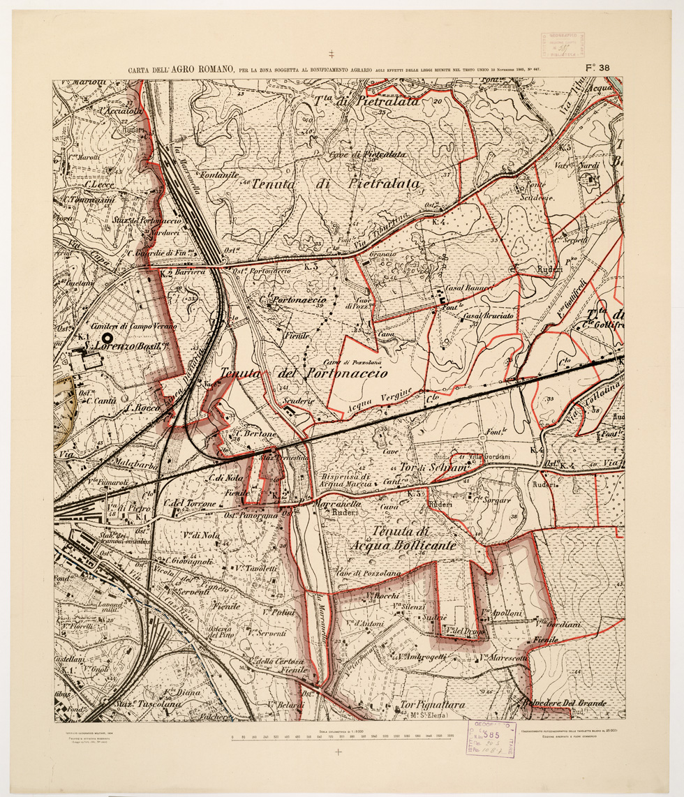 "...NEL RAPPORTO DI 1:8.000 PER LA ZONA SOGGETTA AL BONIFICAMENTO AGRARIO AGLI EFFETTI DELLE LEGGI RIUNITE IN TESTO UNICO CON R. D. NOVEMBRE 1905 N° 647. I.G.M., 1904. Ingrandimento fotozincografico in 77 fogli delle tavolette rilievo al 25.000. Stampa a colori in azzurro per le acque, verde per i limiti dell'agro romano, rosso per quelli della zona soggetta alla bonifica agraria, viola per il territorio suburbano di Roma, rosso per le tenute e le loro divisioni interne azzurro per le linee di spartiacque resto della planimetria in nero. Orografia a curve tracciate alla equidistanza di 5 metri. Annesso un quadro d'unione con elenco delle tenute private."