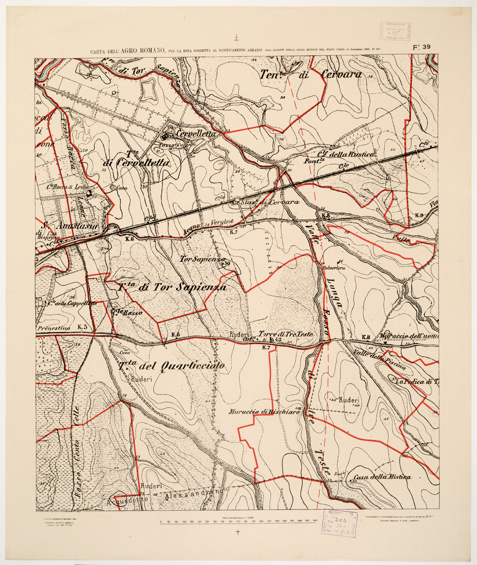 "...NEL RAPPORTO DI 1:8.000 PER LA ZONA SOGGETTA AL BONIFICAMENTO AGRARIO AGLI EFFETTI DELLE LEGGI RIUNITE IN TESTO UNICO CON R. D. NOVEMBRE 1905 N° 647. I.G.M., 1904. Ingrandimento fotozincografico in 77 fogli delle tavolette rilievo al 25.000. Stampa a colori in azzurro per le acque, verde per i limiti dell'agro romano, rosso per quelli della zona soggetta alla bonifica agraria, viola per il territorio suburbano di Roma, rosso per le tenute e le loro divisioni interne azzurro per le linee di spartiacque resto della planimetria in nero. Orografia a curve tracciate alla equidistanza di 5 metri. Annesso un quadro d'unione con elenco delle tenute private."