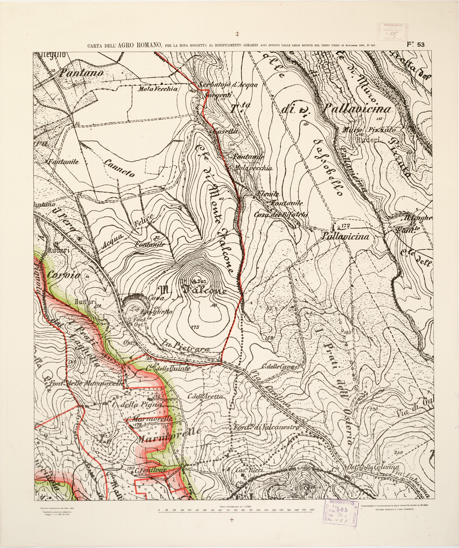 "...NEL RAPPORTO DI 1:8.000 PER LA ZONA SOGGETTA AL BONIFICAMENTO AGRARIO AGLI EFFETTI DELLE LEGGI RIUNITE IN TESTO UNICO CON R. D. NOVEMBRE 1905 N° 647. I.G.M., 1904. Ingrandimento fotozincografico in 77 fogli delle tavolette rilievo al 25.000. Stampa a colori in azzurro per le acque, verde per i limiti dell'agro romano, rosso per quelli della zona soggetta alla bonifica agraria, viola per il territorio suburbano di Roma, rosso per le tenute e le loro divisioni interne azzurro per le linee di spartiacque resto della planimetria in nero. Orografia a curve tracciate alla equidistanza di 5 metri. Annesso un quadro d'unione con elenco delle tenute private."