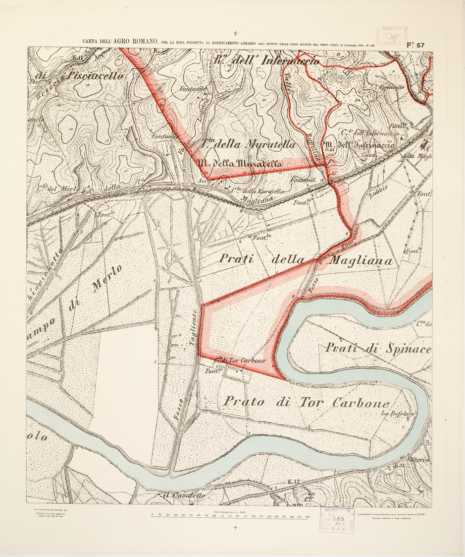 "...NEL RAPPORTO DI 1:8.000 PER LA ZONA SOGGETTA AL BONIFICAMENTO AGRARIO AGLI EFFETTI DELLE LEGGI RIUNITE IN TESTO UNICO CON R. D. NOVEMBRE 1905 N° 647. I.G.M., 1904. Ingrandimento fotozincografico in 77 fogli delle tavolette rilievo al 25.000. Stampa a colori in azzurro per le acque, verde per i limiti dell'agro romano, rosso per quelli della zona soggetta alla bonifica agraria, viola per il territorio suburbano di Roma, rosso per le tenute e le loro divisioni interne azzurro per le linee di spartiacque resto della planimetria in nero. Orografia a curve tracciate alla equidistanza di 5 metri. Annesso un quadro d'unione con elenco delle tenute private."
