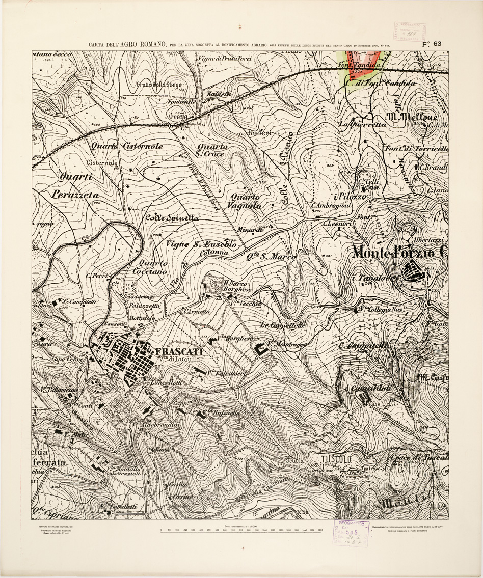"...NEL RAPPORTO DI 1:8.000 PER LA ZONA SOGGETTA AL BONIFICAMENTO AGRARIO AGLI EFFETTI DELLE LEGGI RIUNITE IN TESTO UNICO CON R. D. NOVEMBRE 1905 N° 647. I.G.M., 1904. Ingrandimento fotozincografico in 77 fogli delle tavolette rilievo al 25.000. Stampa a colori in azzurro per le acque, verde per i limiti dell'agro romano, rosso per quelli della zona soggetta alla bonifica agraria, viola per il territorio suburbano di Roma, rosso per le tenute e le loro divisioni interne azzurro per le linee di spartiacque resto della planimetria in nero. Orografia a curve tracciate alla equidistanza di 5 metri. Annesso un quadro d'unione con elenco delle tenute private."