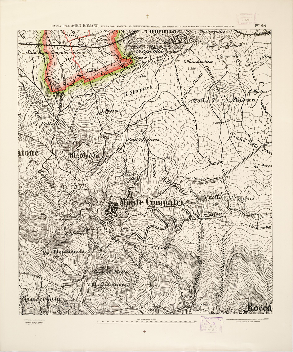 "...NEL RAPPORTO DI 1:8.000 PER LA ZONA SOGGETTA AL BONIFICAMENTO AGRARIO AGLI EFFETTI DELLE LEGGI RIUNITE IN TESTO UNICO CON R. D. NOVEMBRE 1905 N° 647. I.G.M., 1904. Ingrandimento fotozincografico in 77 fogli delle tavolette rilievo al 25.000. Stampa a colori in azzurro per le acque, verde per i limiti dell'agro romano, rosso per quelli della zona soggetta alla bonifica agraria, viola per il territorio suburbano di Roma, rosso per le tenute e le loro divisioni interne azzurro per le linee di spartiacque resto della planimetria in nero. Orografia a curve tracciate alla equidistanza di 5 metri. Annesso un quadro d'unione con elenco delle tenute private."