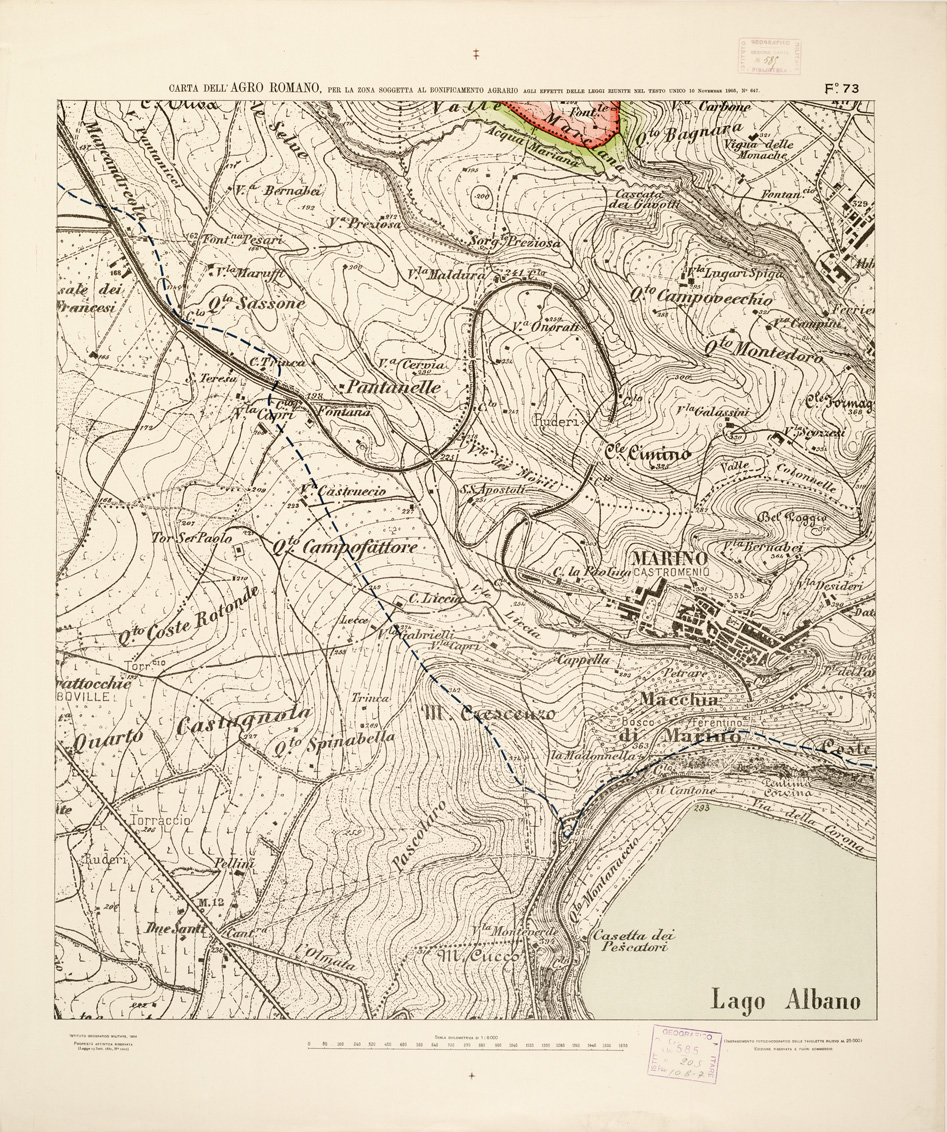 "...NEL RAPPORTO DI 1:8.000 PER LA ZONA SOGGETTA AL BONIFICAMENTO AGRARIO AGLI EFFETTI DELLE LEGGI RIUNITE IN TESTO UNICO CON R. D. NOVEMBRE 1905 N° 647. I.G.M., 1904. Ingrandimento fotozincografico in 77 fogli delle tavolette rilievo al 25.000. Stampa a colori in azzurro per le acque, verde per i limiti dell'agro romano, rosso per quelli della zona soggetta alla bonifica agraria, viola per il territorio suburbano di Roma, rosso per le tenute e le loro divisioni interne azzurro per le linee di spartiacque resto della planimetria in nero. Orografia a curve tracciate alla equidistanza di 5 metri. Annesso un quadro d'unione con elenco delle tenute private."