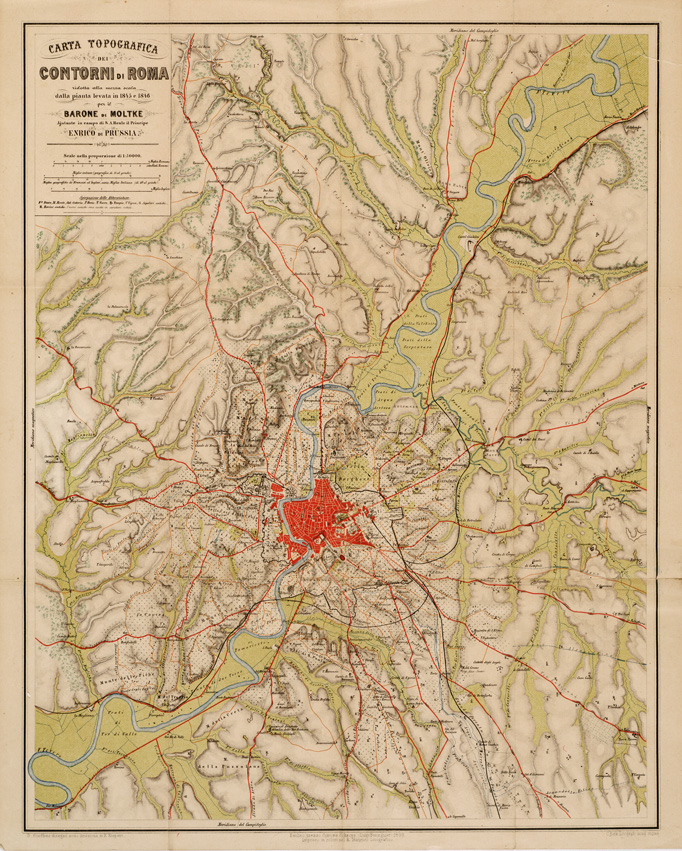 "...RIDOTTA ALLA MEZZA SCALA DALLA PIANTA LEVATA IN 1845 E 1846 PER IL BARONE DI MOLTKE. BERLINO. PRESSO SIMONE SCHROPP. IMPRESSO IN COLORI NEL R. ISTITUTO LITOGRAFICO. Un foglio stampato a colori disegnato da G. Steffens sotto la direzione di H. Kiepert, inciso su pietra da C. Birk. Mostra l'orografia con il tratteggio in nero, con fondo derivato dal giallo per il terreno elevato, verde per le pianure e le valli la pianta di Roma e le strade principali sono in rosso, le acque in azzurro, le vegetazioni in verde. "