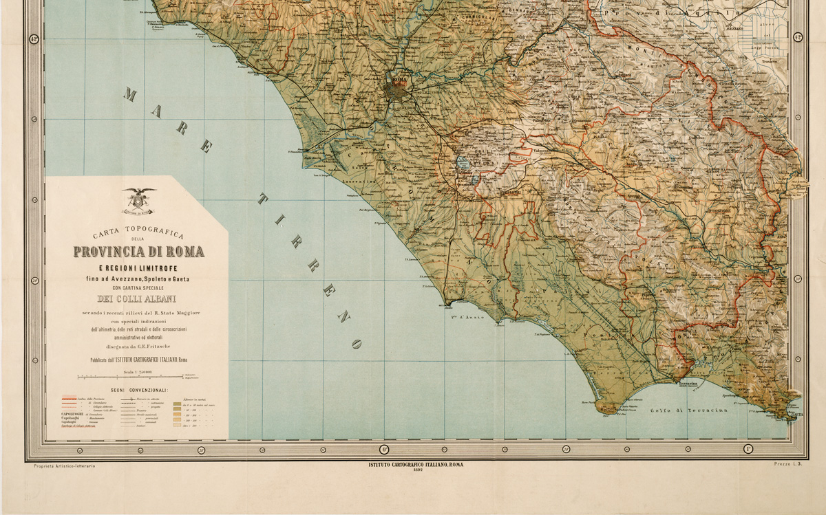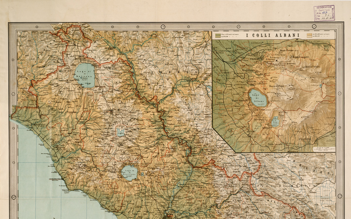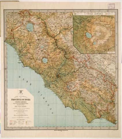 CARTA TOPOGRAFICA DELLA PROVINCIA DI ROMAE REGIONI LIMITROFE FINO AD AVEZZANO, SPOLETO E GAETA CON CARTINA SPECIALE DEI COLLI ALBANI SECONDO I RECENTI RILIEVI DEL REGIO STATO MAGGIORE