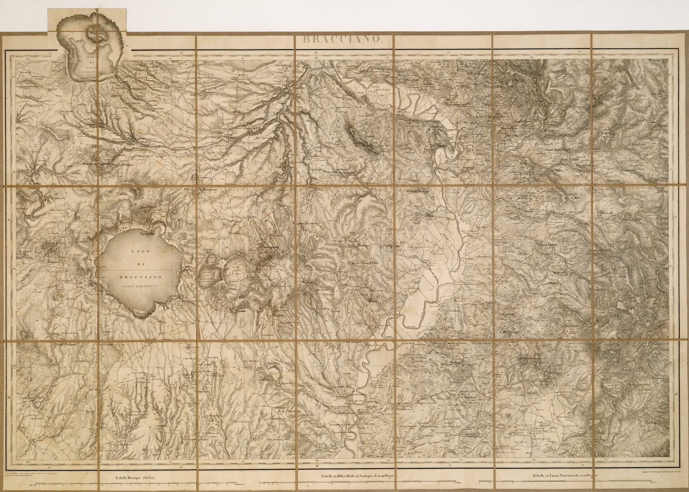 "...REDIGEE ET GRAVEE AU DEPOT DE LA GUERRE A' L'ECHELLE DE 1:80.000 D'APRES LA TRIANGULATION ET LES LEVES EXECUTES PAR LES OFFICIERS DU CORPS D'ETAT MAJOR ETANT DIRECTEUR LE COLONEL BLONDEL PARIS, 1856. Carta in tre fogli (Civitavecchia, Bracciano, Rome) rilevata dagli ufficiali della brigata topografica della Divisione francese durante l'occupazione del 1849, stampati da Kaeppelin a Parigi. Nitida incisione su rame di Erchard Schieble. Orografia rappresentata col tratteggio a luce obliqua. Rappresenta il territorio compreso tra Corneto Belmonte, Cisterna e la costa tirrenica. Annesso un quarto foglio con il piano di Roma alla scala di 1:20.000 con elenco alfabetico-numerico de principali monumenti moderni ed antichi. Il documento di Biblioteca - Inv. Gen. 225 - è composto solo da due fogli (Bracciano e Civitavecchia - Files B0002569-70) il documento d'Archivio - Cart. D'Arch. 70/71 - Docum. 8 - è completo (Files A0001278-85). "