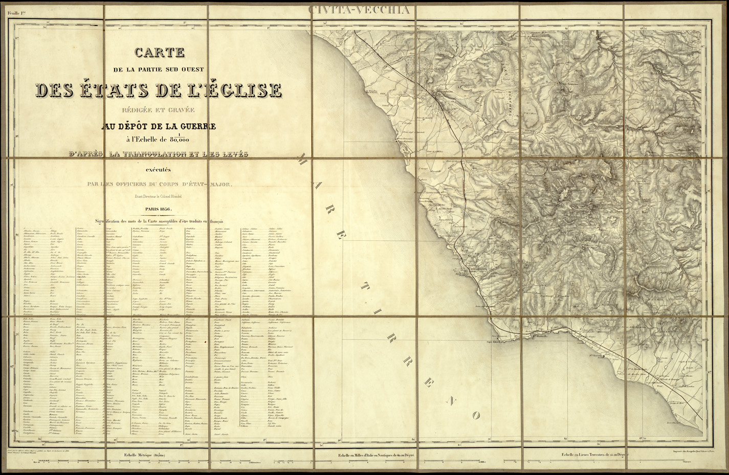 "...REDIGEE ET GRAVEE AU DEPOT DE LA GUERRE A' L'ECHELLE DE 1:80.000 D'APRES LA TRIANGULATION ET LES LEVES EXECUTES PAR LES OFFICIERS DU CORPS D'ETAT MAJOR ETANT DIRECTEUR LE COLONEL BLONDEL PARIS, 1856. Carta in tre fogli (Civitavecchia, Bracciano, Rome) rilevata dagli ufficiali della brigata topografica della Divisione francese durante l'occupazione del 1849, stampati da Kaeppelin a Parigi. Nitida incisione su rame di Erchard Schieble. Orografia rappresentata col tratteggio a luce obliqua. Rappresenta il territorio compreso tra Corneto Belmonte, Cisterna e la costa tirrenica. Annesso un quarto foglio con il piano di Roma alla scala di 1:20.000 con elenco alfabetico-numerico de principali monumenti moderni ed antichi. "