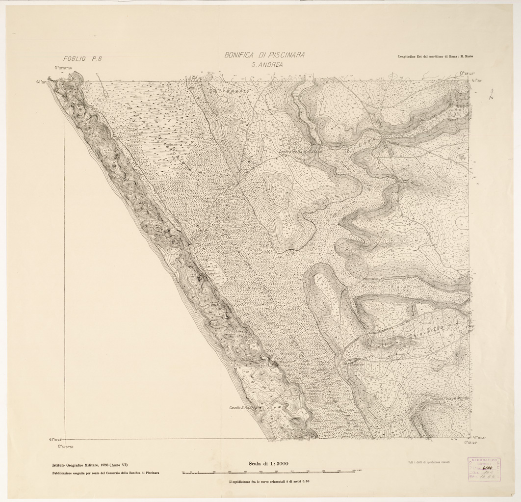"Rappresentazione orografica a curve di livello, l'equidistanza fra le curve orizzontali è di metri 0,50. I.G.M., pubblicazione eseguita per conto del Consorzio della Bonifica di Piscinara."
