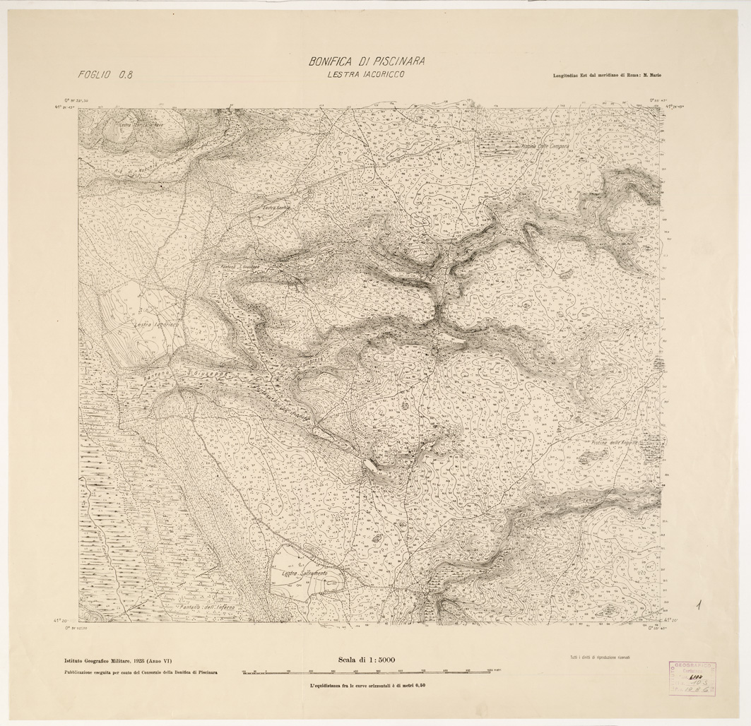 "Rappresentazione orografica a curve di livello, l'equidistanza fra le curve orizzontali è di metri 0,50. I.G.M., pubblicazione eseguita per conto del Consorzio della Bonifica di Piscinara."