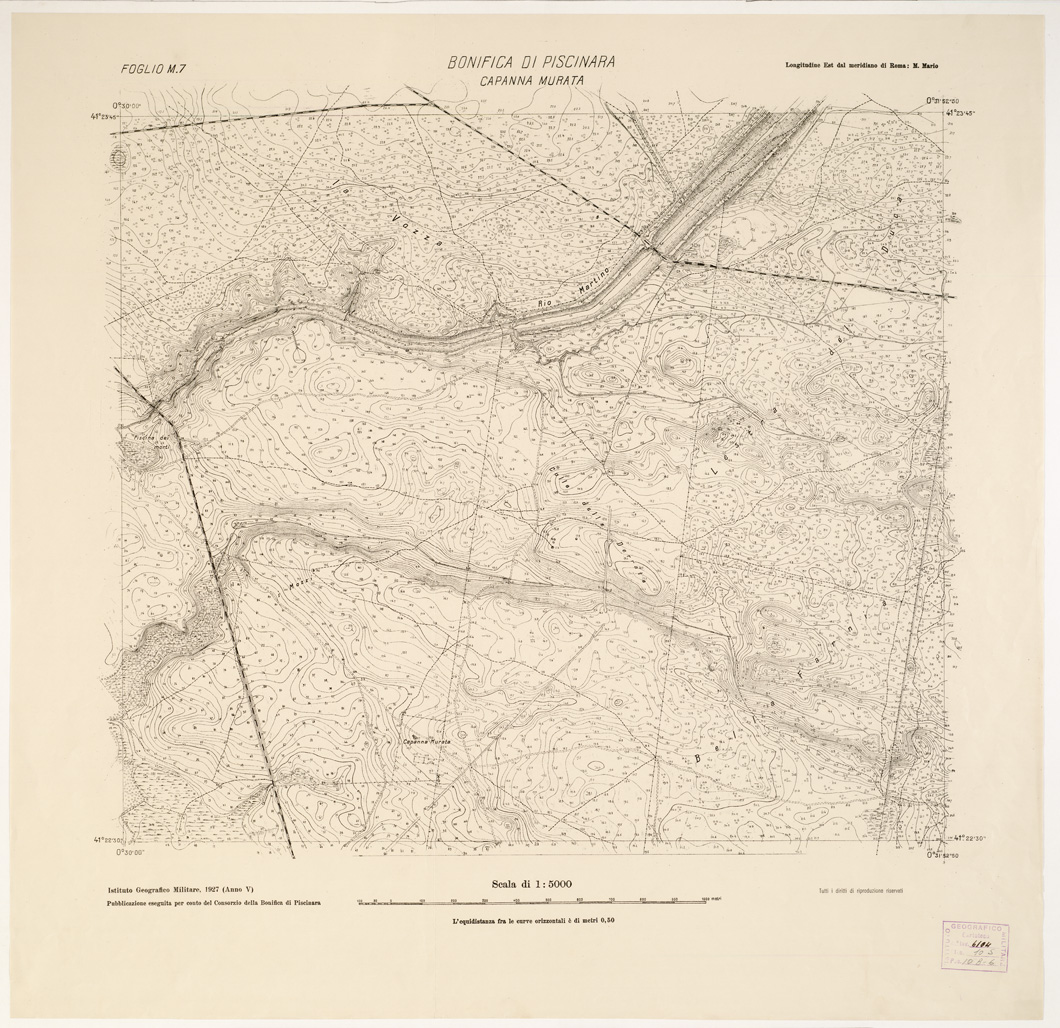 "Rappresentazione orografica a curve di livello, l'equidistanza fra le curve orizzontali è di metri 0,50. I.G.M., pubblicazione eseguita per conto del Consorzio della Bonifica di Piscinara."