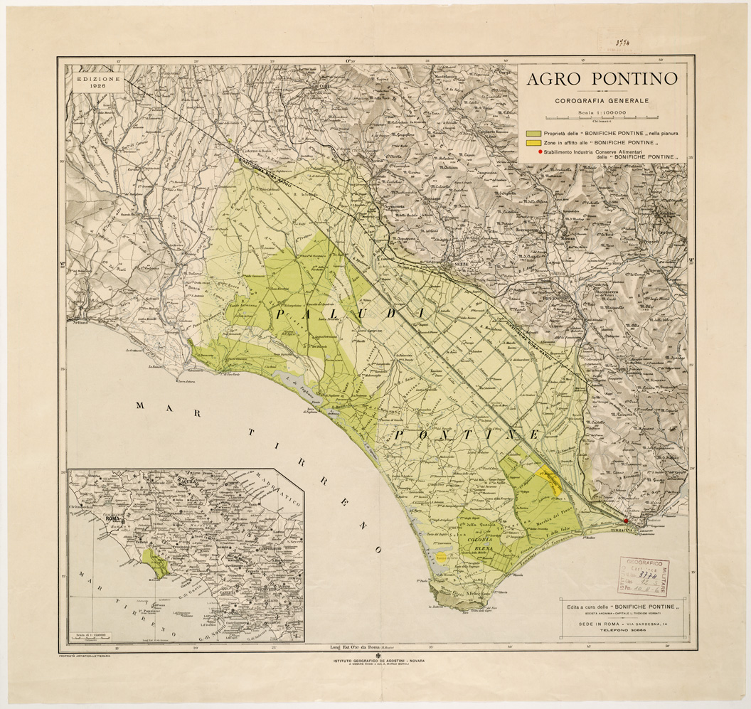" Rappresentazione orografica a sfumo. Istituto Geografico De Agostini, Novara. Edita a cura delle "Bonifiche Pontine". Nel riquadro in basso a sinistra vi è una carta generale alla scala di 1:1.500.000."