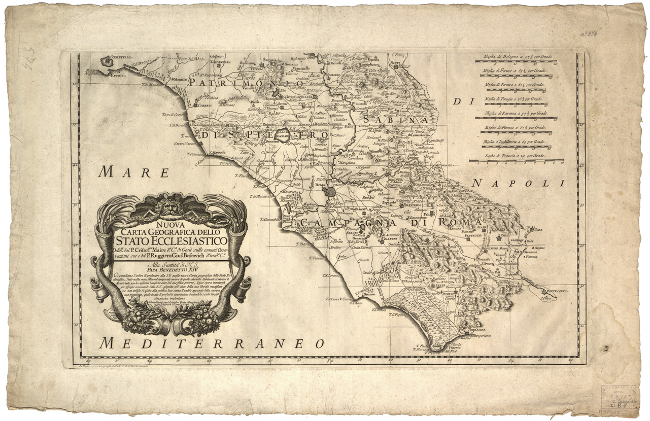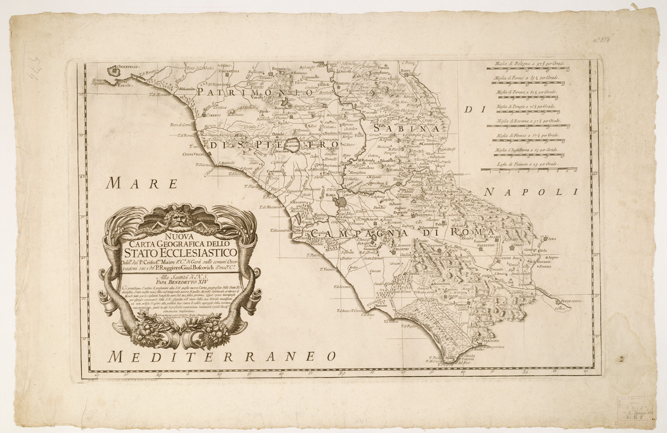 "Carta costruita sulla base delle operazioni intraprese dal P. Ruggero Boscovich e il P. Cristoforo Maire sotto il pontificato di Papa Benedetto XIV per la misura dell'arco di meridiano di circa 2° da Roma a Rimini per contribuire alla soluzione della allora dibattuta questione della irregolarità della forma della terra. In tale occasione si vollero estendere le osservazioni astronomiche e geodetiche a fine di rettificare la carta dello Stato Pontificio, la quale perciò risultò la prima carta parziale d'Italia fondata su operazioni scientifiche. Essa venne incisa su rame e pubblicata in 3 fogli nel 1755 alla Calcografia Pontificia. La copia della Collez. Bianconi n. 233 (File B0012901-3) è montata su tela a stacchi in foglio unico quella dell'inv. gen. è in tre fogli con orografia a colori. La carta si estende dalle foci del Po al Tronto sull'Adriatico ad ovest si limita al confine dello Stato Pontificio sul Tirreno comprende il tratto costiero Porto Ercole-T. d.a Cerva. L'orografia è rappresentata con tratteggio. Gli abitati principali sono rappresentati in pianta con distinzione degli arcivescovadi, vescovadi, città, terre, ecc. E' tracciata la rete stradale. In alto a destra trovasi una notizia in cui gli A.A. spiegano la formazione della carta. A sinistra una tavola dei nomi in latino di alcune città, castelli e fiumi. Sotto il titolo la dedica a Papa Benedetto XIV. Dieci scale grafiche in varie antiche misure di città italiane, in leghe di Francia e in miglia d'Inghilterra. Cfr. MORI A. La cartografia ufficiale in Italia e l'I.G.M., pagg. 74-78. Il n. 4253 d'inventario (File B0002446-B0002447-B0002448-B0002449), consta di quattro tavole, finemente scolpite nella Calcografia Camerale, riferentisi ai lavori di triangolazioni eseguiti dal 1750 al 1753 dal Padre Boscovich ed agli strumenti da lui usati. "
